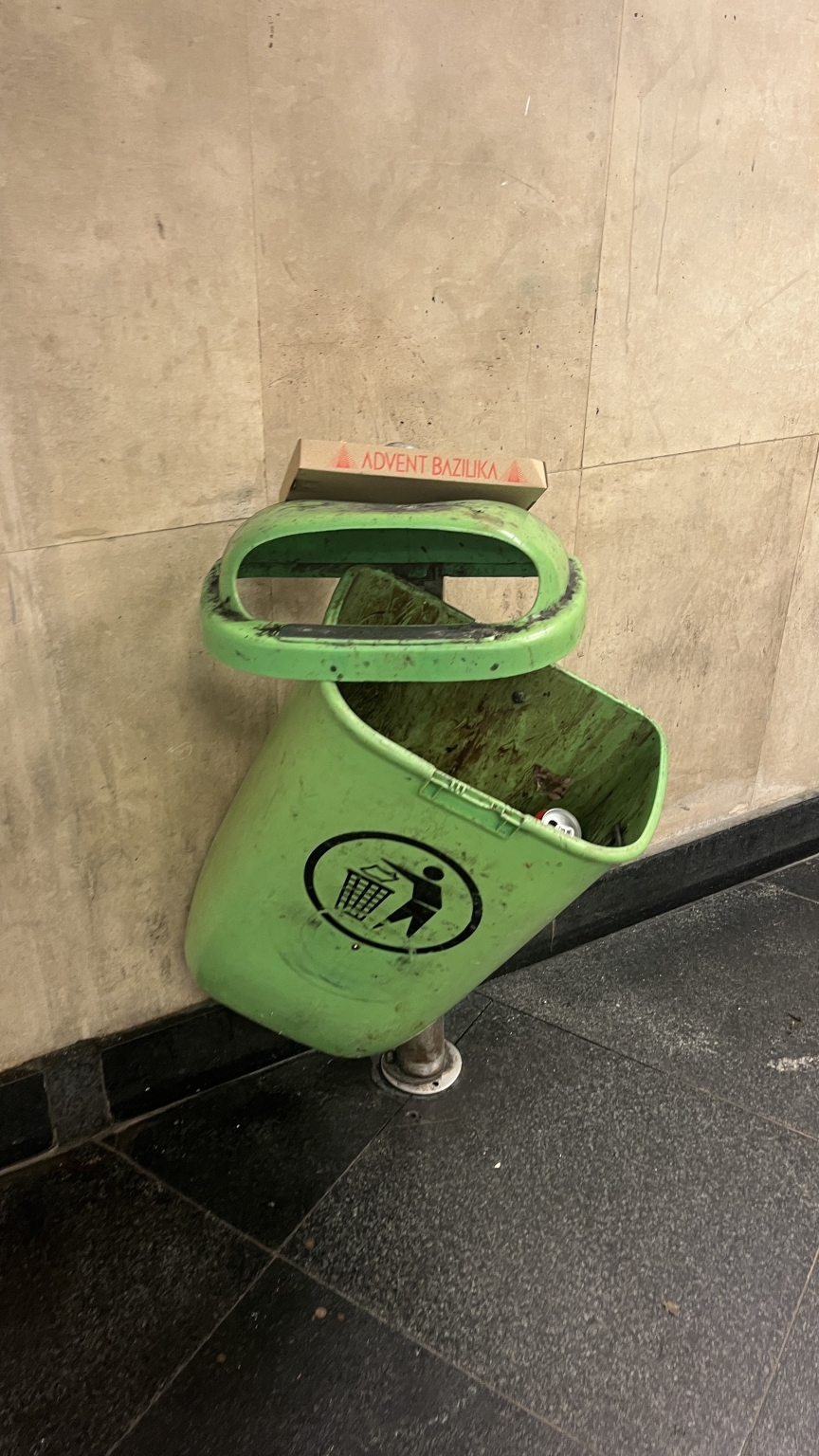 A Deák téri aluljáróban elmozdult az ott található egyetlen kuka. Továbbá javaslom, minden kijáratnál helyezzenek el kukát, mert az egész aluljáróban csak itt van kuka és ez meg is látszik.