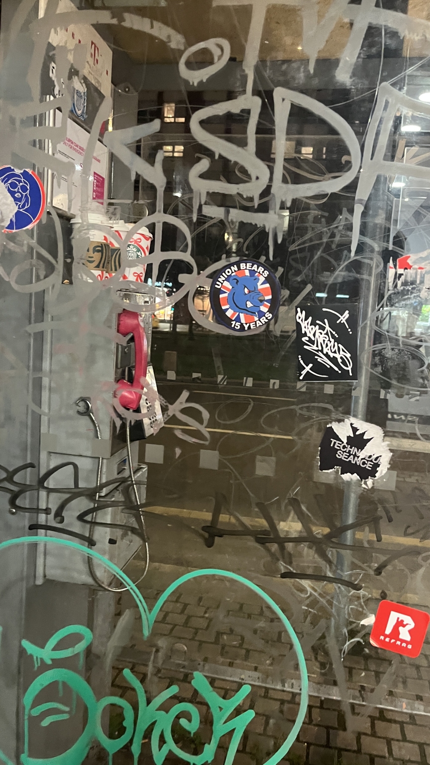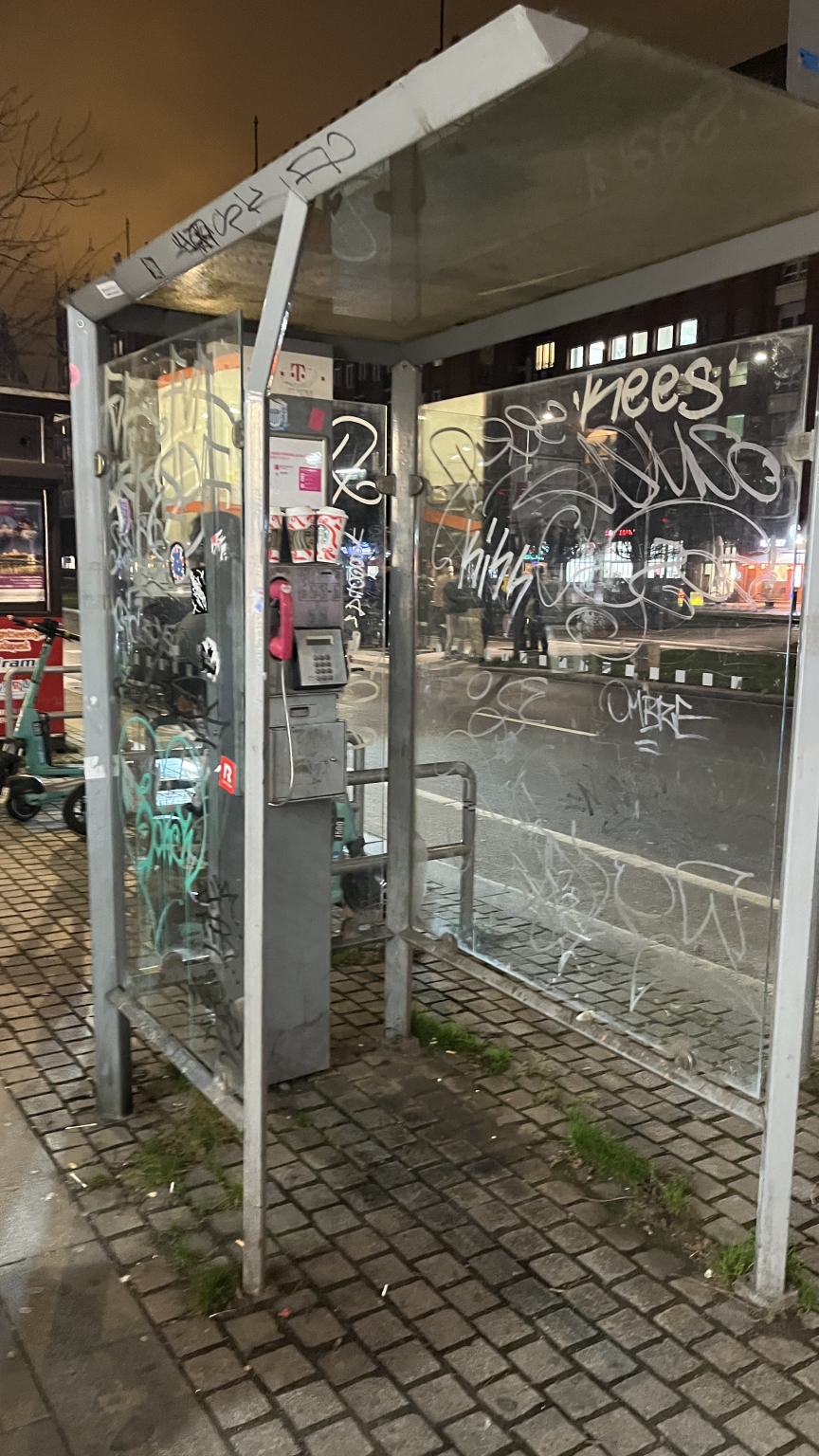 A Károly körúton, a dm közelében tele van graffitizve a telefonfülke. Nagyon koszos és tele van szeméttel.