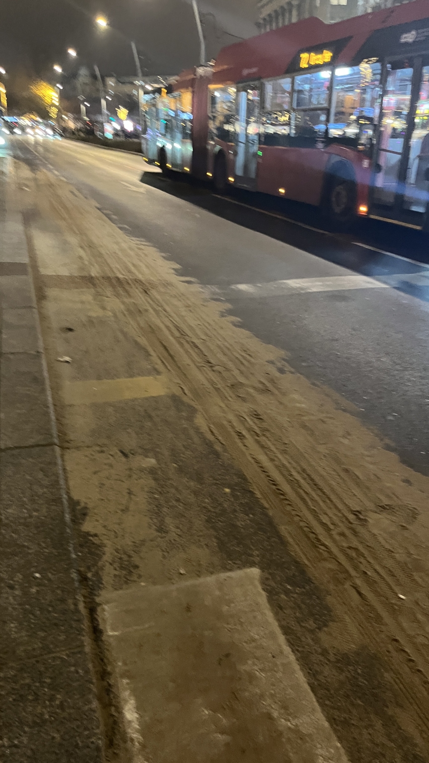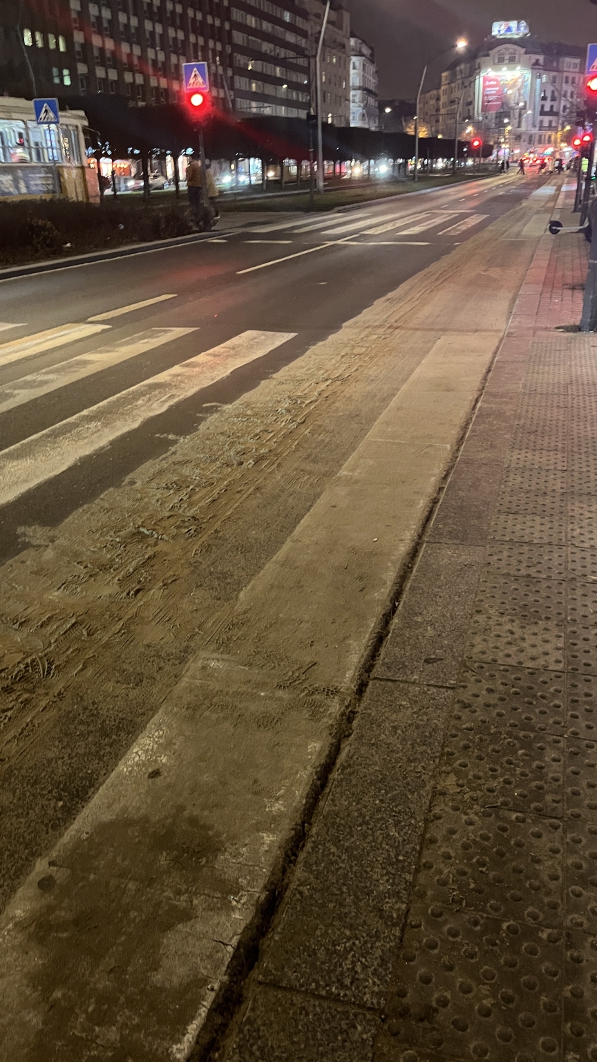A Károly körúton, a Városháza park bejárata mellett a biciklisáv homokkal szennyezett. Kérem a takarítását, mert kerékpárral balesetveszélyes, majdnem elvágódtam itt.