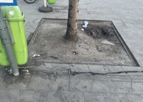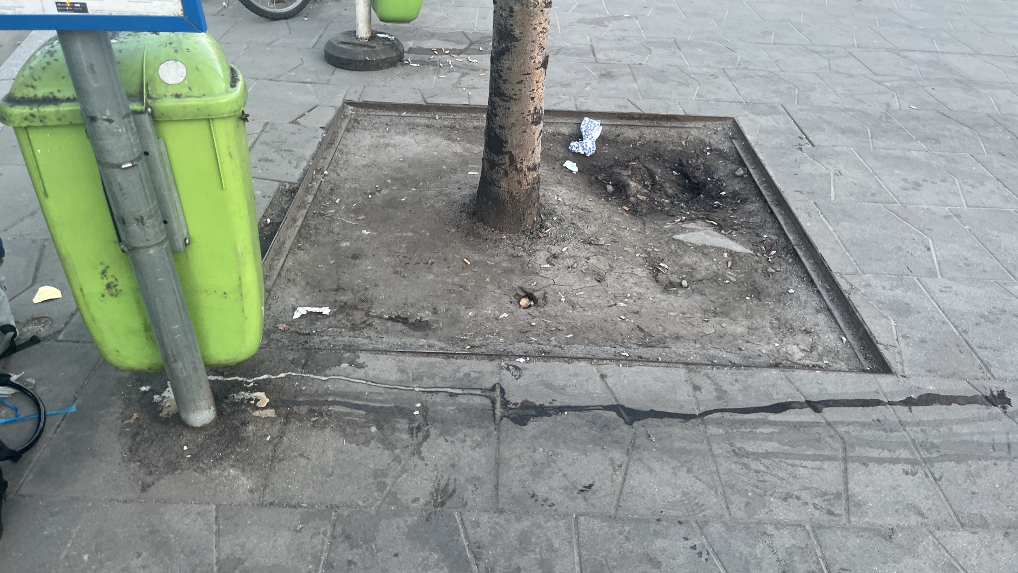 A Deák téri 100E megállóban a turistákkal kidobatott kávék, italok állandóan kifolynak ebből a koszos, bűzlő kukából. Hol a járdára, hol a fa vermébe. Az elmúlt hetekben a kukát átfordították az oszlop túloldalára, amely így a fa vermébe lépve érhető el.
