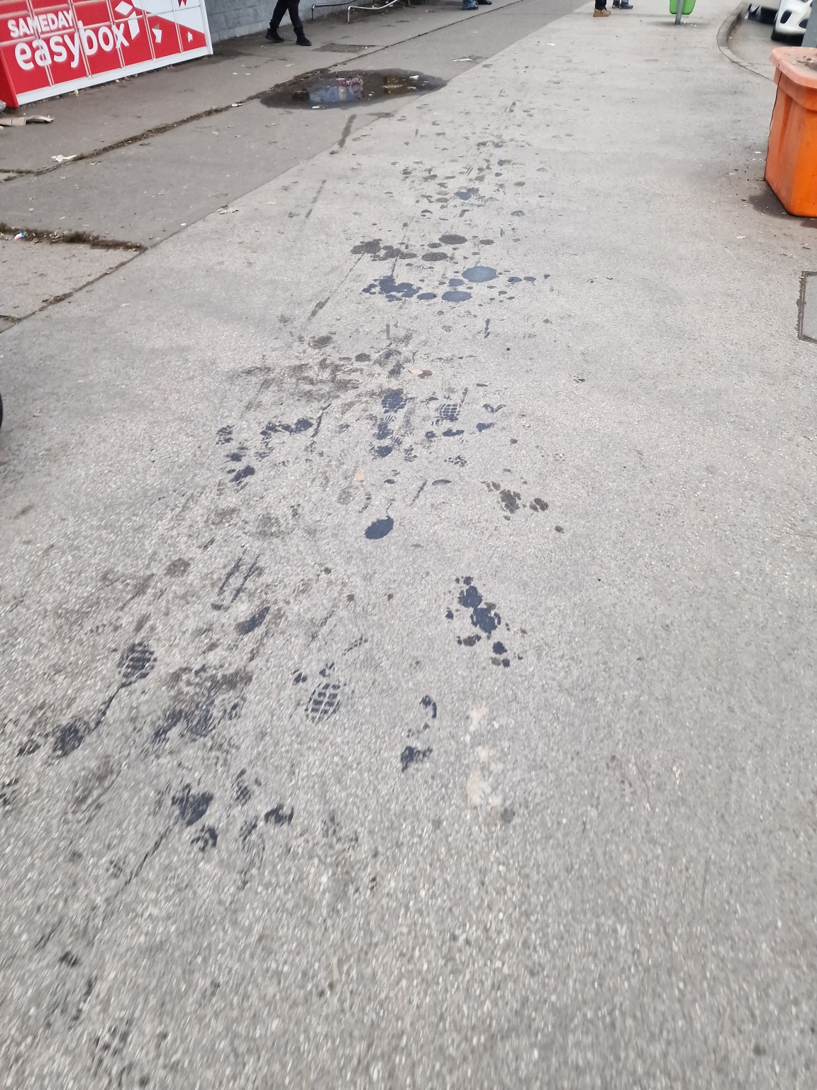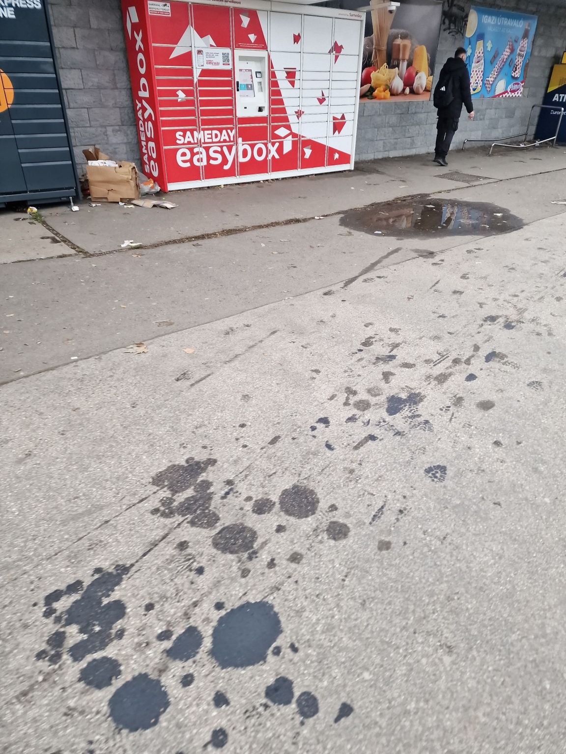 A Budaörsi út 115. előtti járdára felhajtó áruszállító furgonból kifolyt az olaj és a gyalogosok széthordják az olajfoltot a talpukon. A két csomagautomata között már egy hete gyűlik a szemét.
