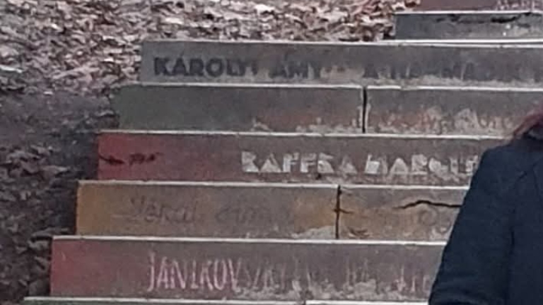 A Glücklich Vilma lépcsőn már nehezen kivehetők a könyvfeliratok.