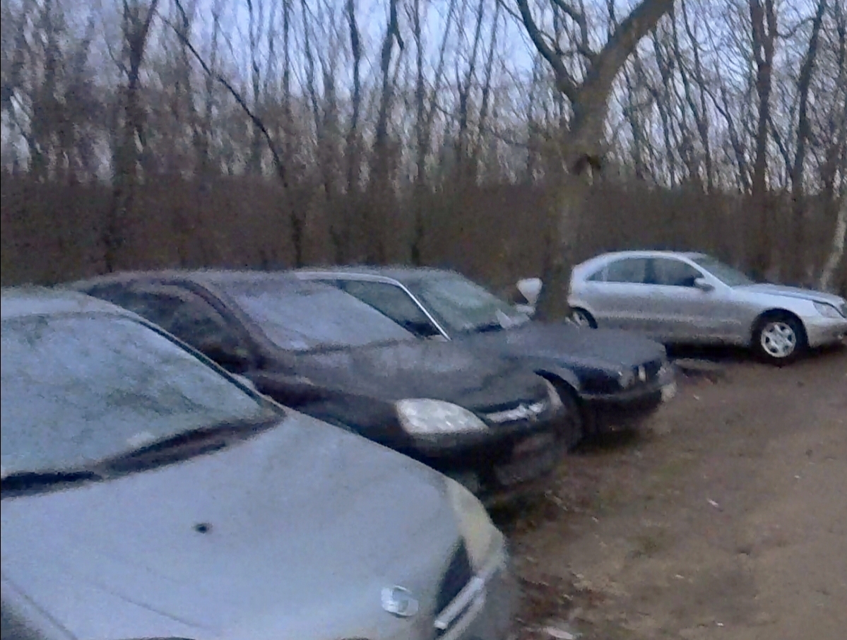Képen látható helyen több bontott, rendszám nélküli autó található, folyadék felfogásra pedig karton papírt használnak kármentő tálca helyett. Ez közterület.