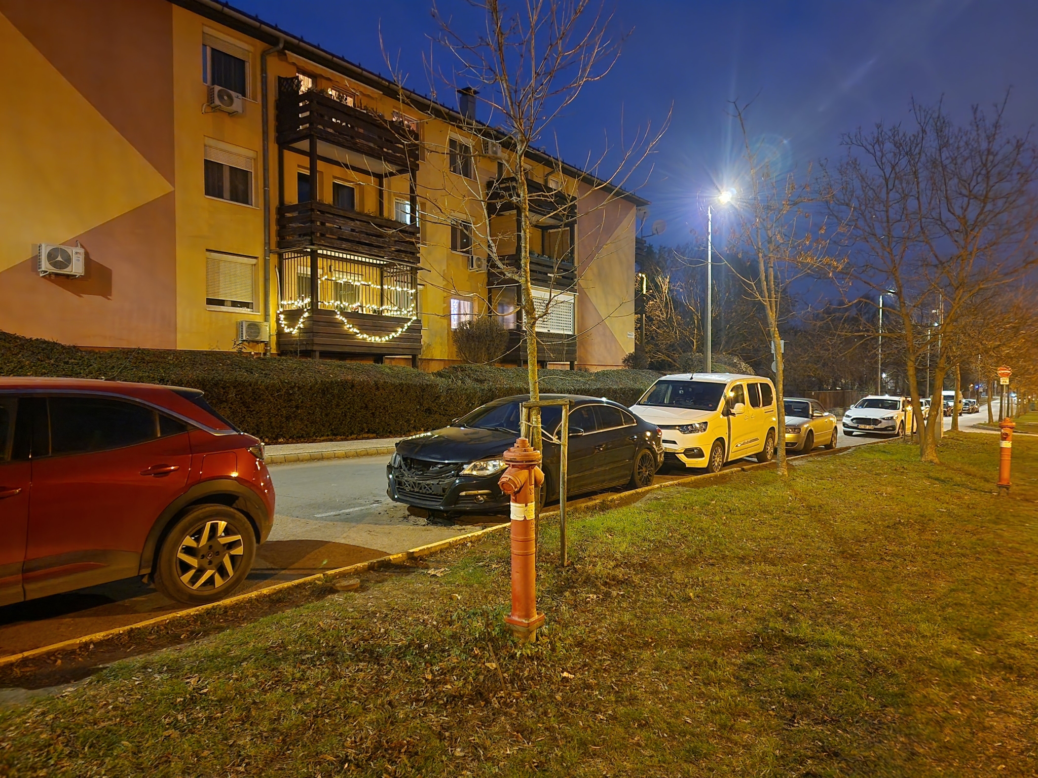 A Rodostó utca 4-gyel szemben egy fekete Volkswagen Passat várakozik összetörve, rendszám nélkül.