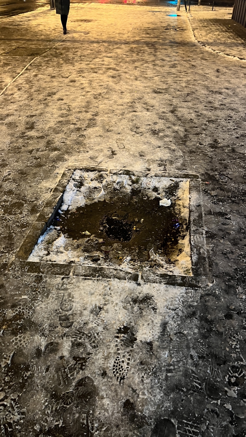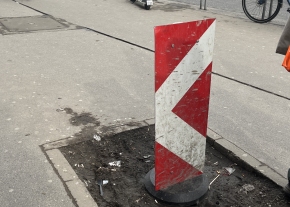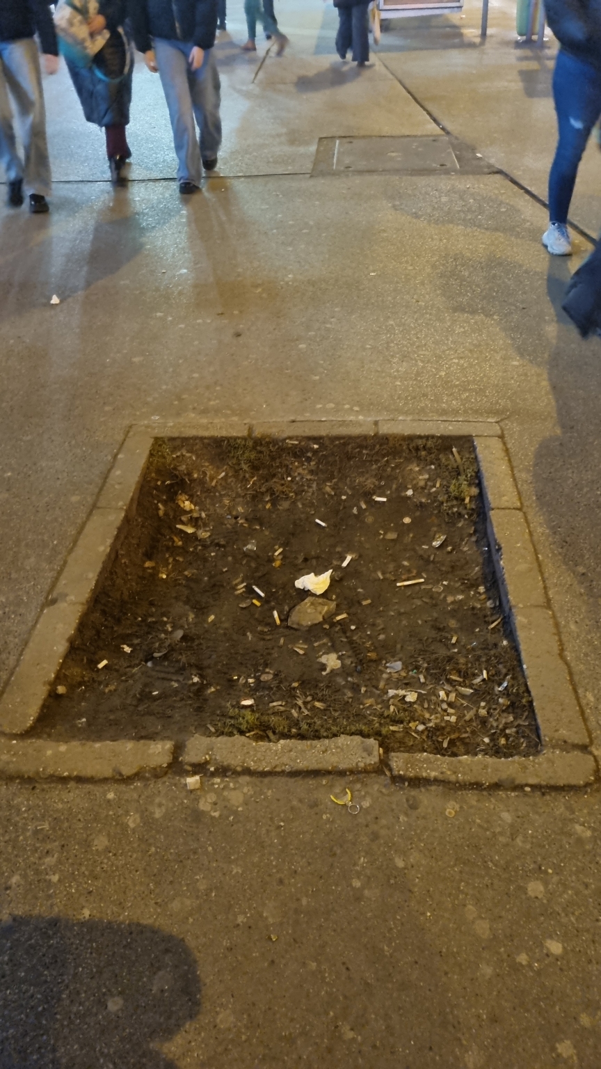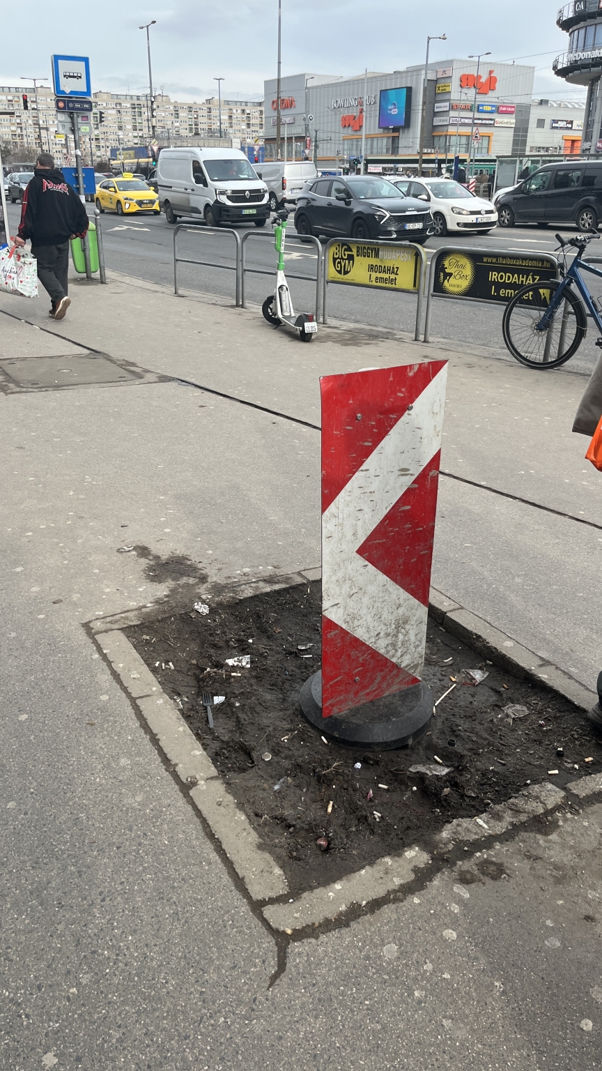 Az Örs vezér tere buszmegállók és metrókijárat közötti szakaszon látszolag felesleges, de veszélyes, talán faültetésre alkalmas lyuk tátong.