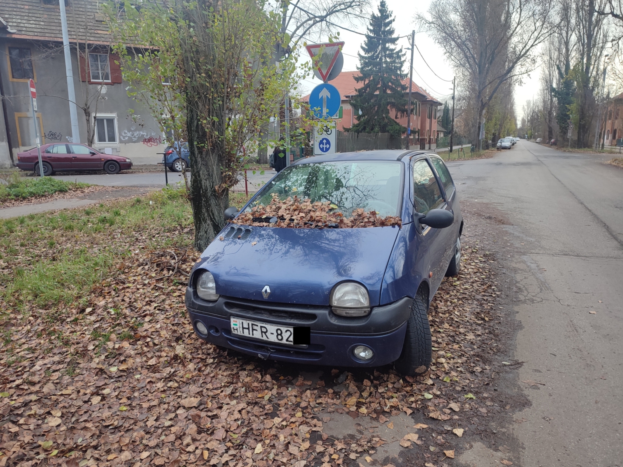 A Pannónia út - Álmos utca sarkán áll egy vélhetően elhagyott, betört hátsó szélvédőjű Renault Twingo. Benne és körülötte szemét.