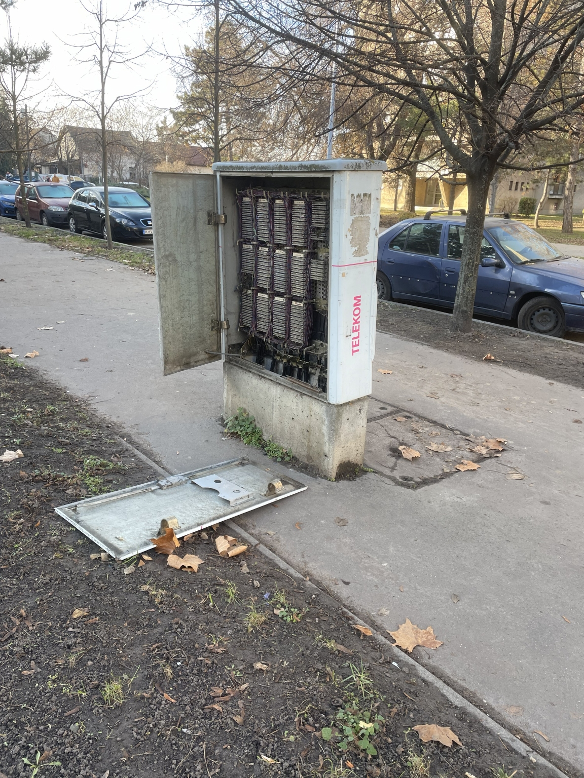 Ajtó leesett, félig nyitott Telekom kapcsolószekrény a Lakatos út 14-el szemközti oldalon. 18.kerület.