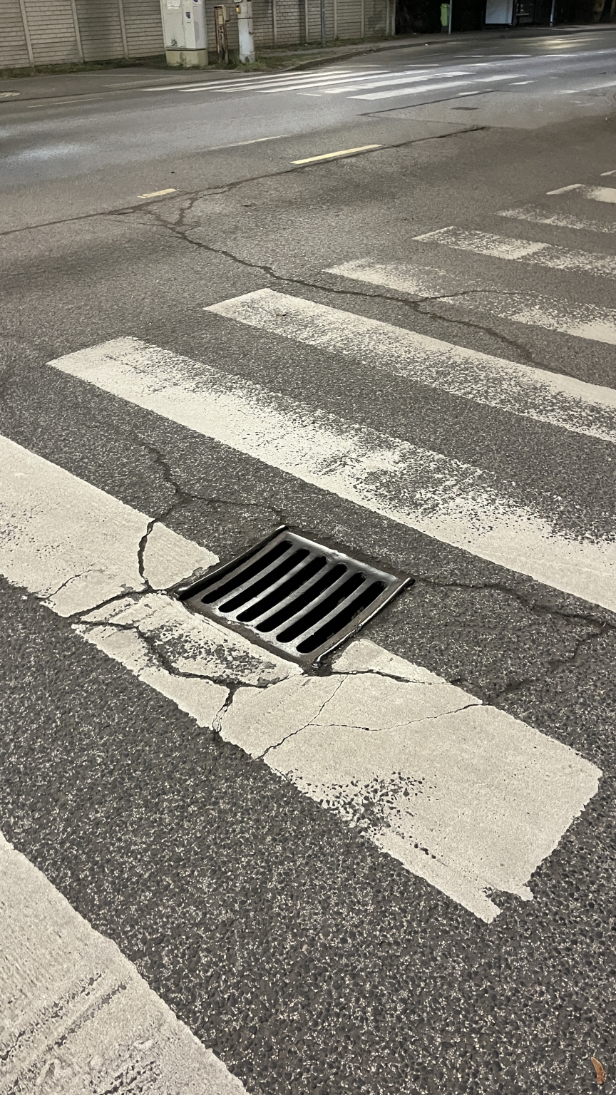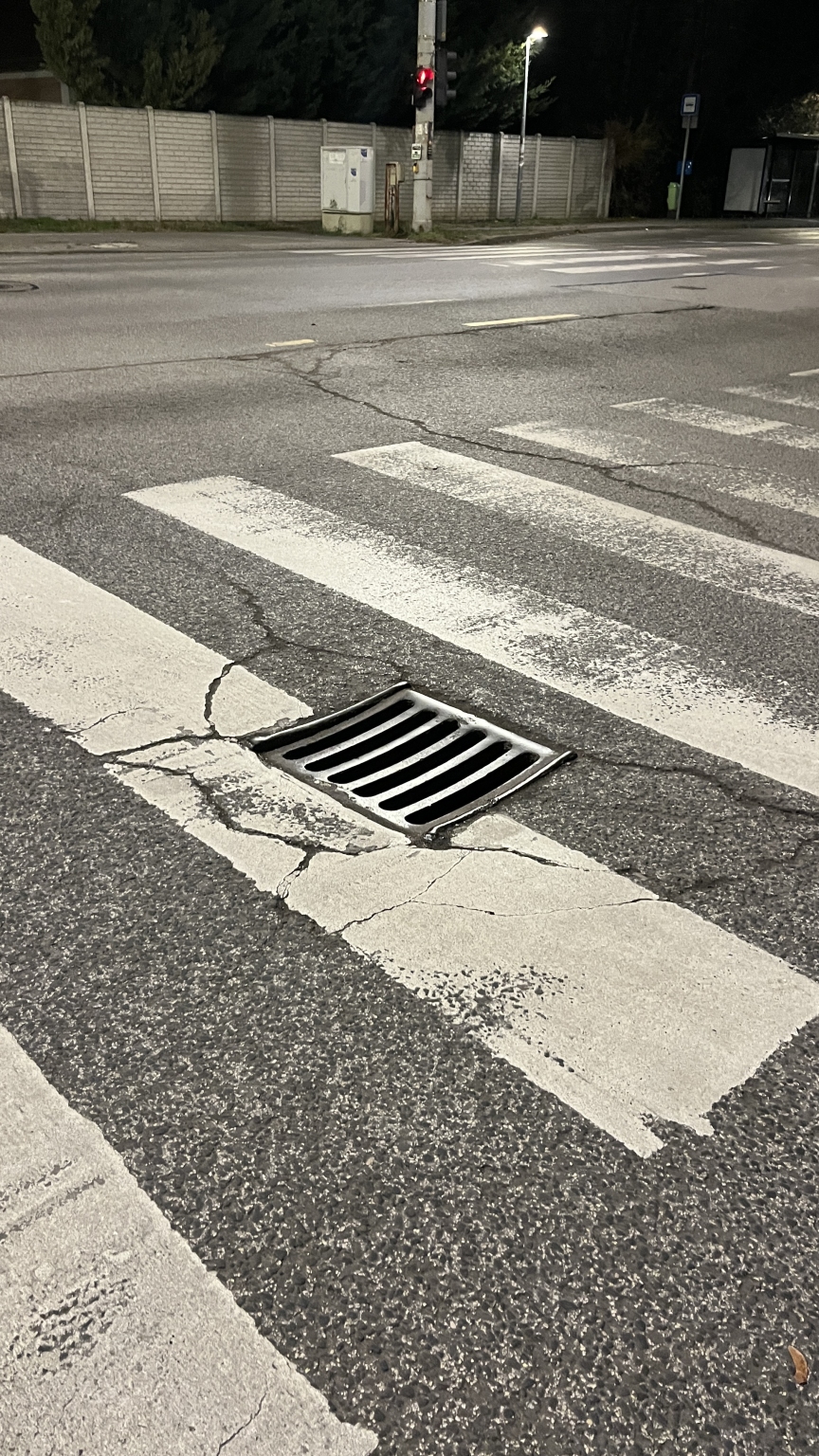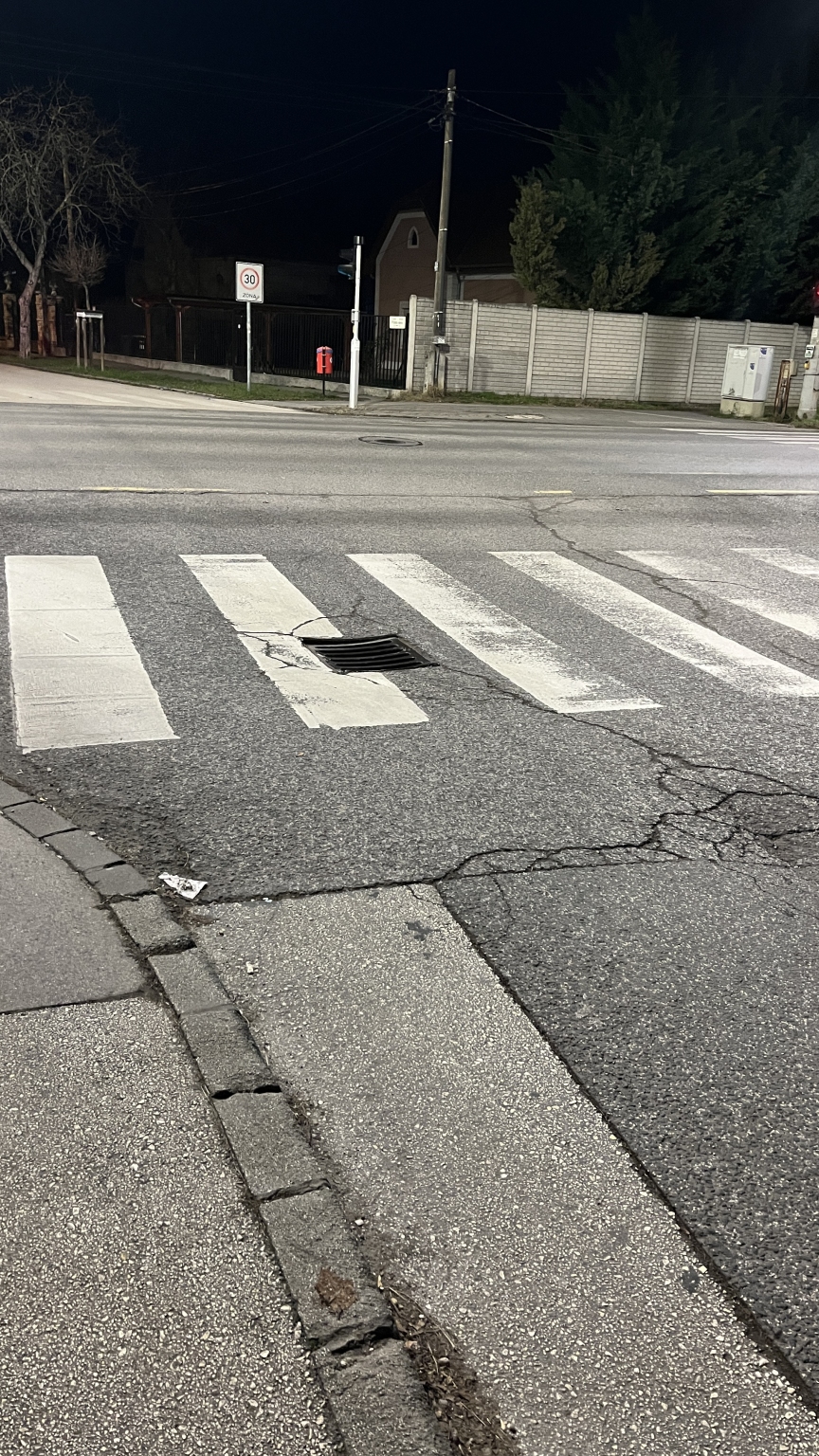A térképen jelölt zebrán a folyóka megsüllyedt, balesetveszélyes. Szeretném kérni a szintezését. Köszönöm!