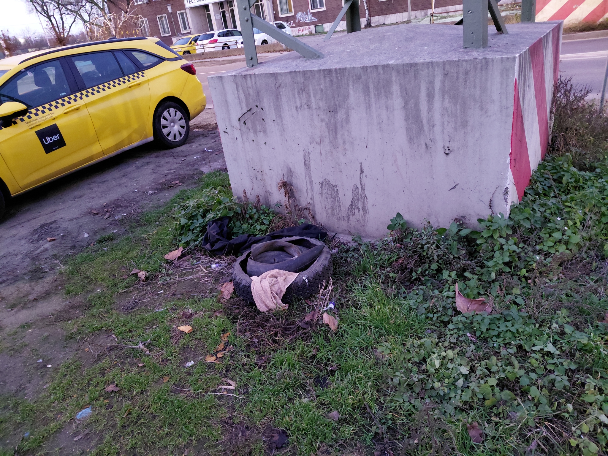 Kőbányán, a Fertő utca és a Makk utca sarkánál, a Fertő utca déli oldalán, a gyalogátkelő mellett, a legközelebbi távvezetékoszlop lábánál eldobott autógumi és más szemét hever.