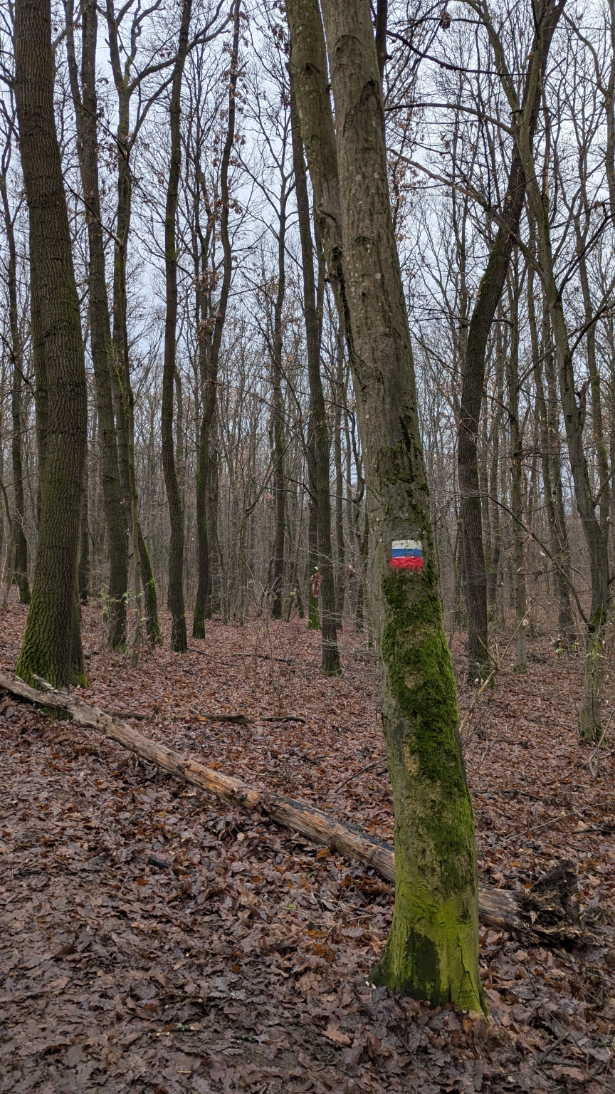 Orosz zászlóvá alakították ezen a ponton: 47.549992,18.968675 az OKT kék túrajelzését egy piros csík felfestésével