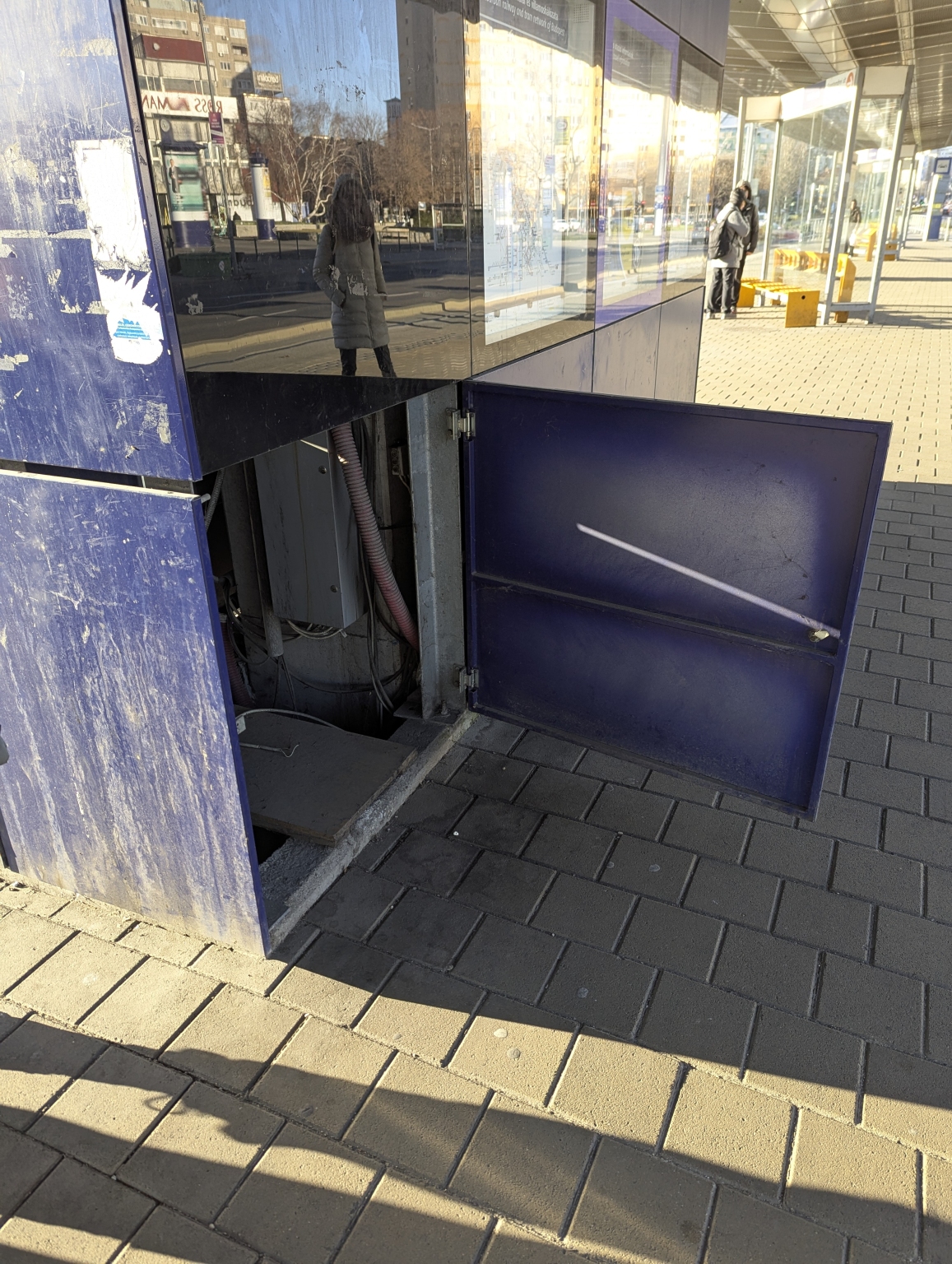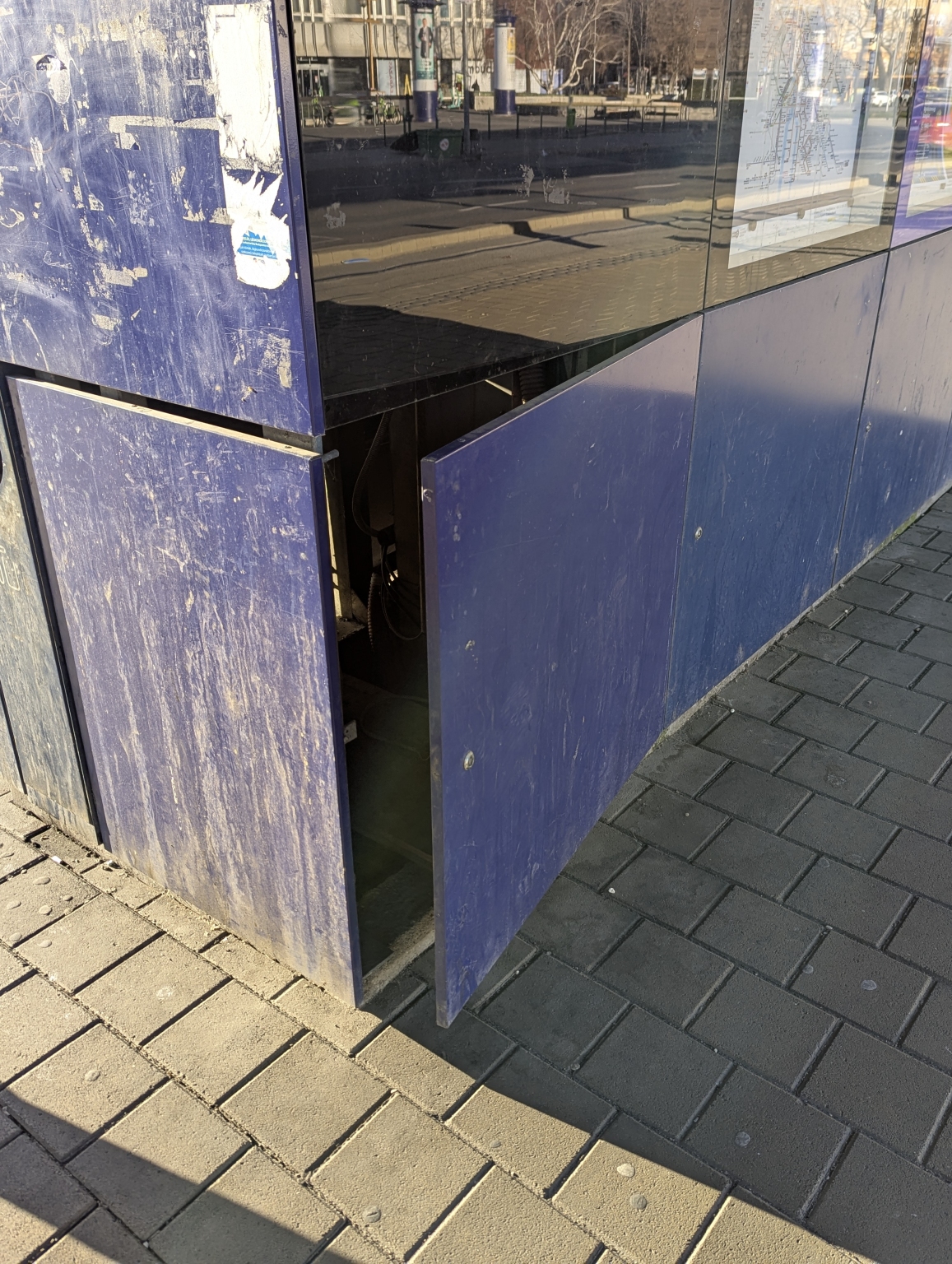 Nyitva van és rángatja a szél a Flórián tér 1-es villamos megálló automata ajtaját.