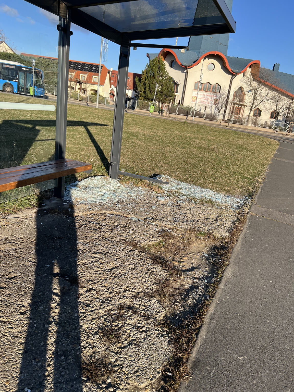 Tisztelt járókelők mai napon vettem észre hogy a hideg szél miatt ki törhetett a busz megállóban az ablak szeretném jelezni az illetékes felé