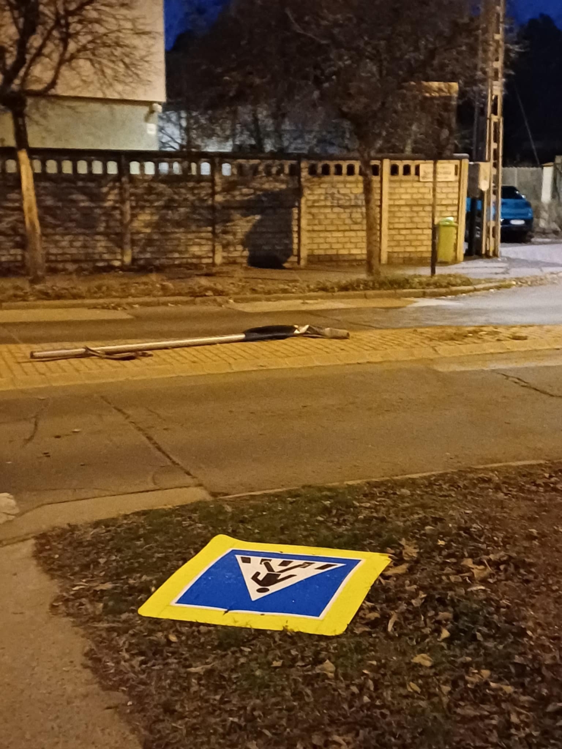 Gyalogátkelőhelyet jelző kidőlt közlekedési jelzőtábla a Budapest XV. ker., Szerencs u. - Dalnoki Jenő u. kereszteződésénél.