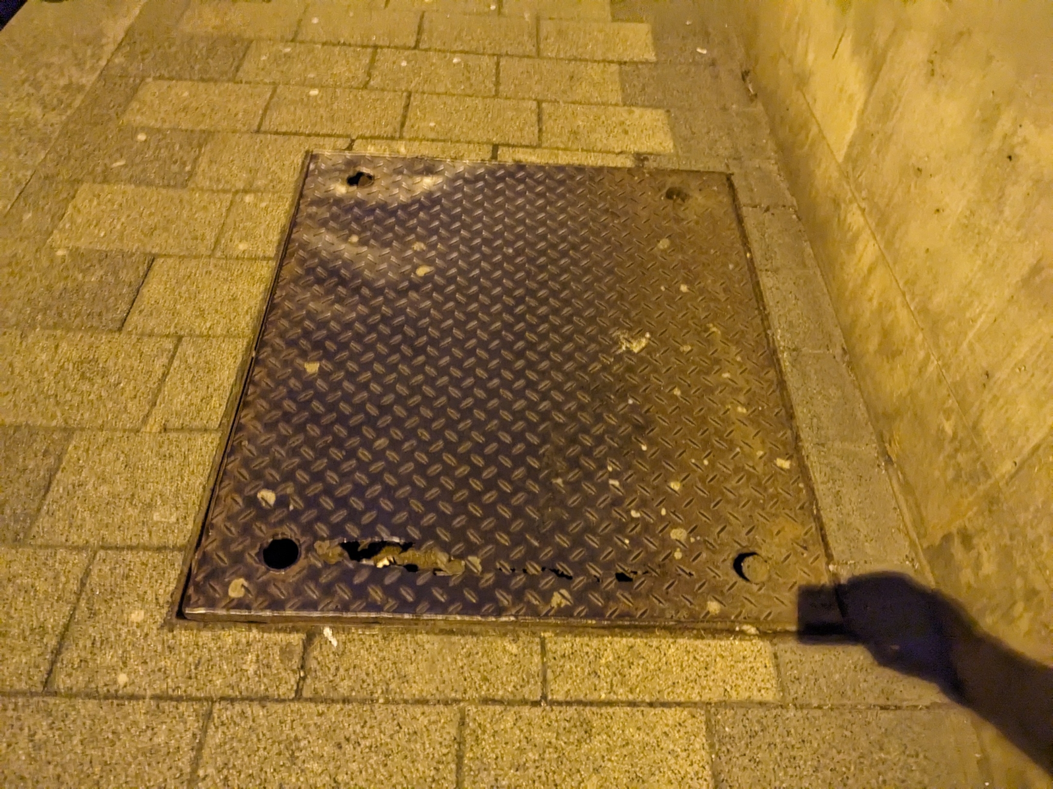 Lyukas, rozsdás aknafedlap 1056 Molnár utca 51. előtt.