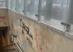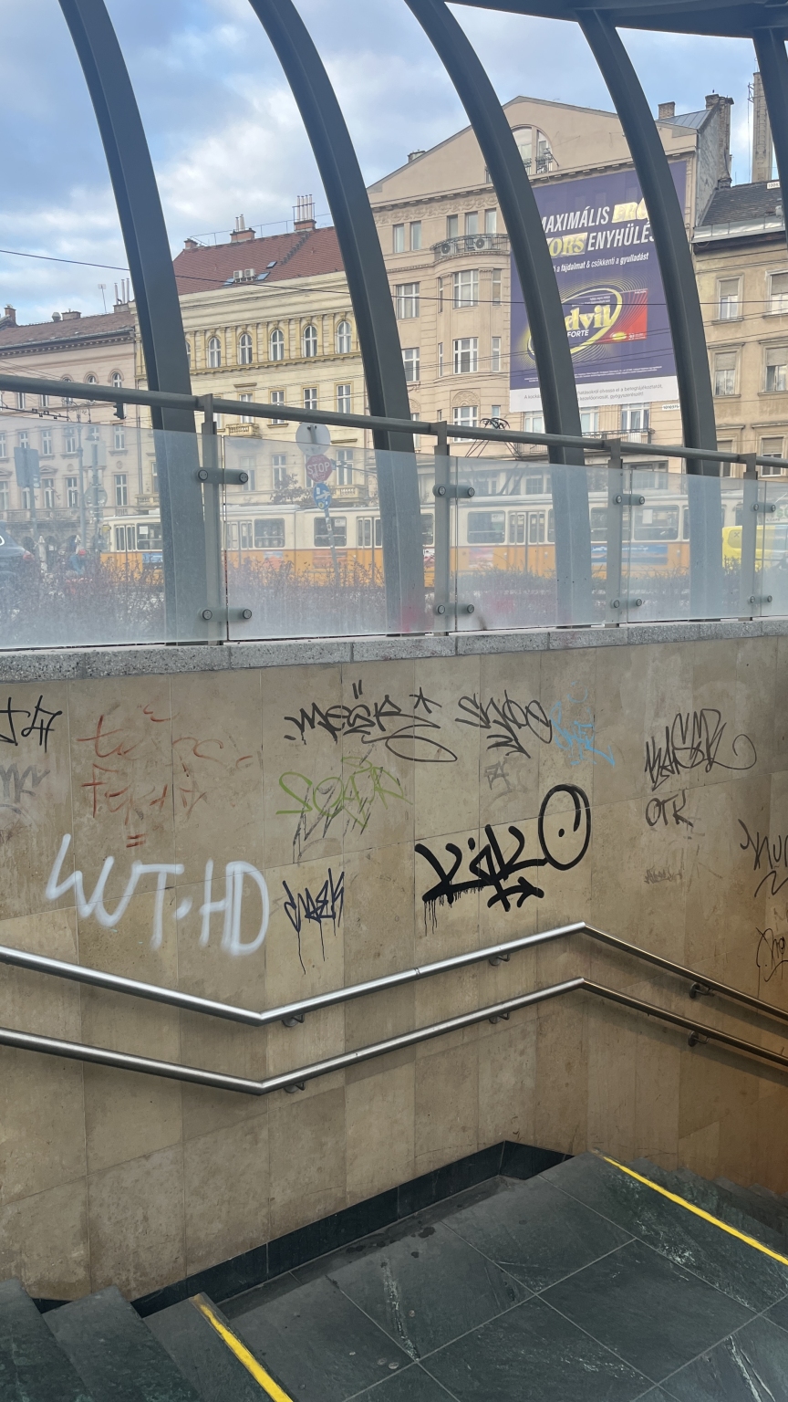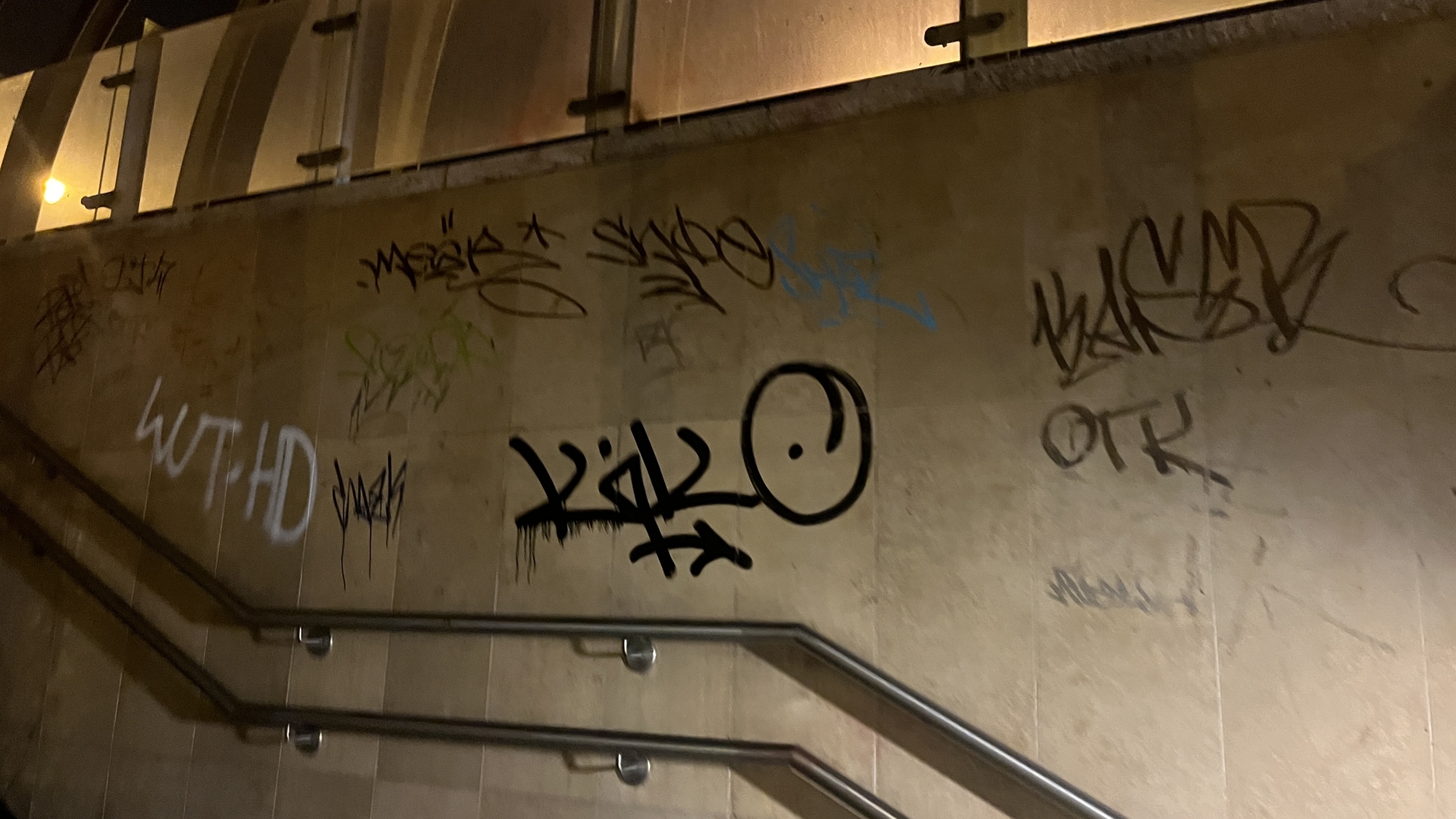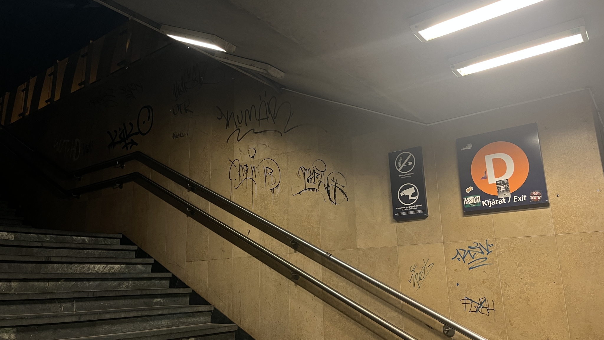 A Kálvin téri aluljáró ‘D’ kijáratánál az oldalfalat összegraffitizték.