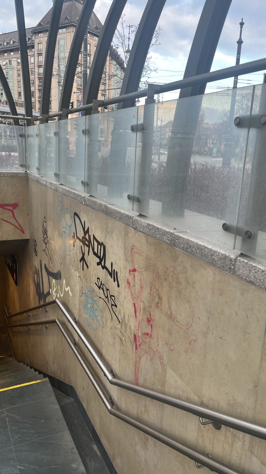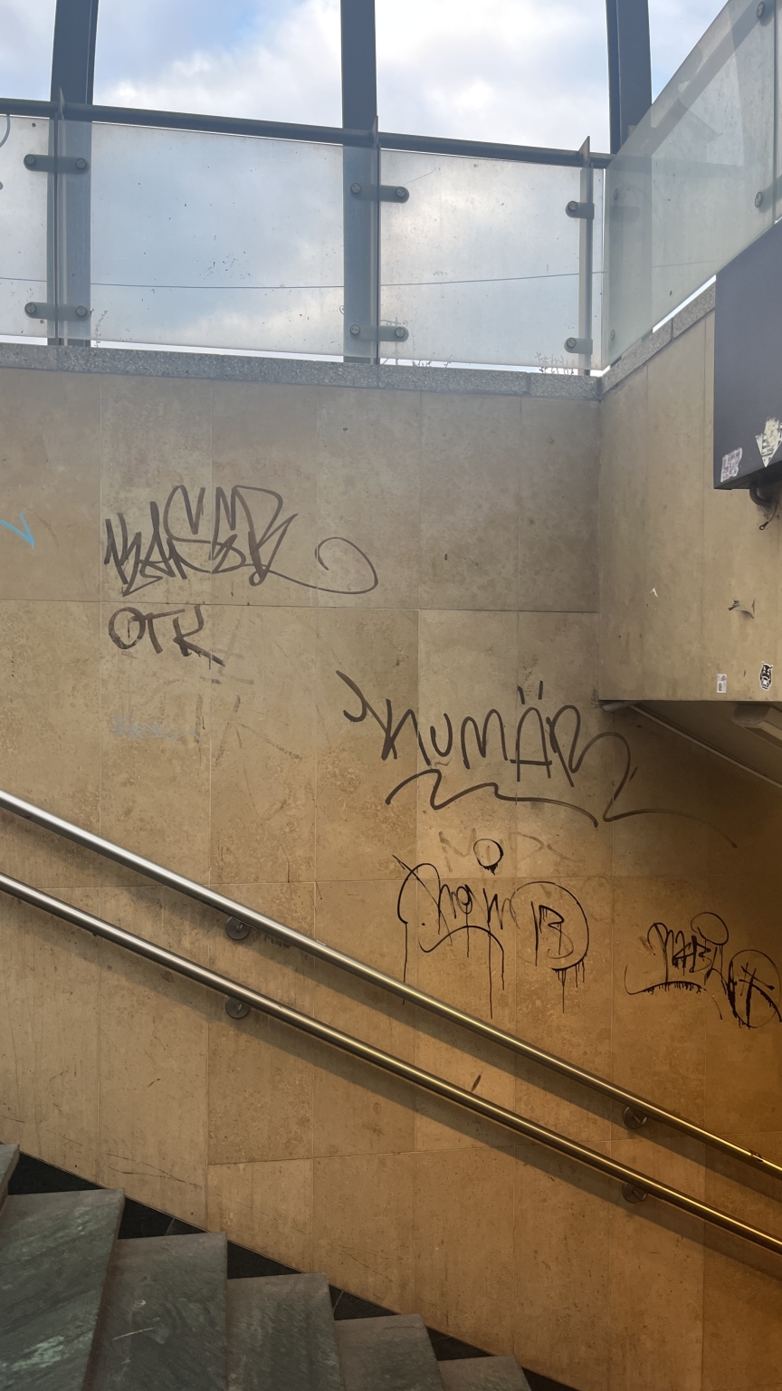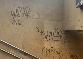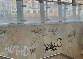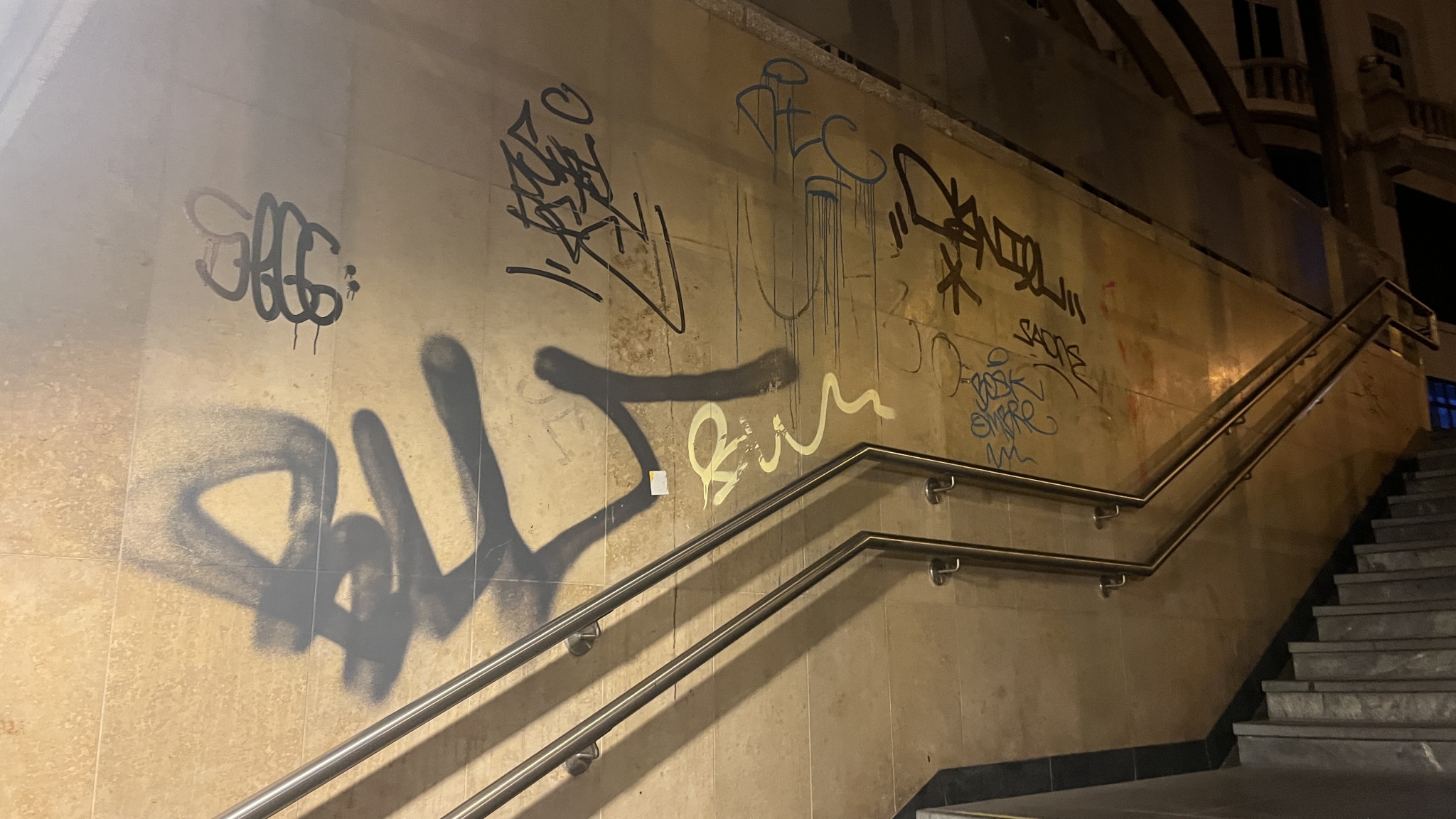 A Kálvin téri aluljáró ‘D’ kijáratánál az oldalfalat összegraffitizték.