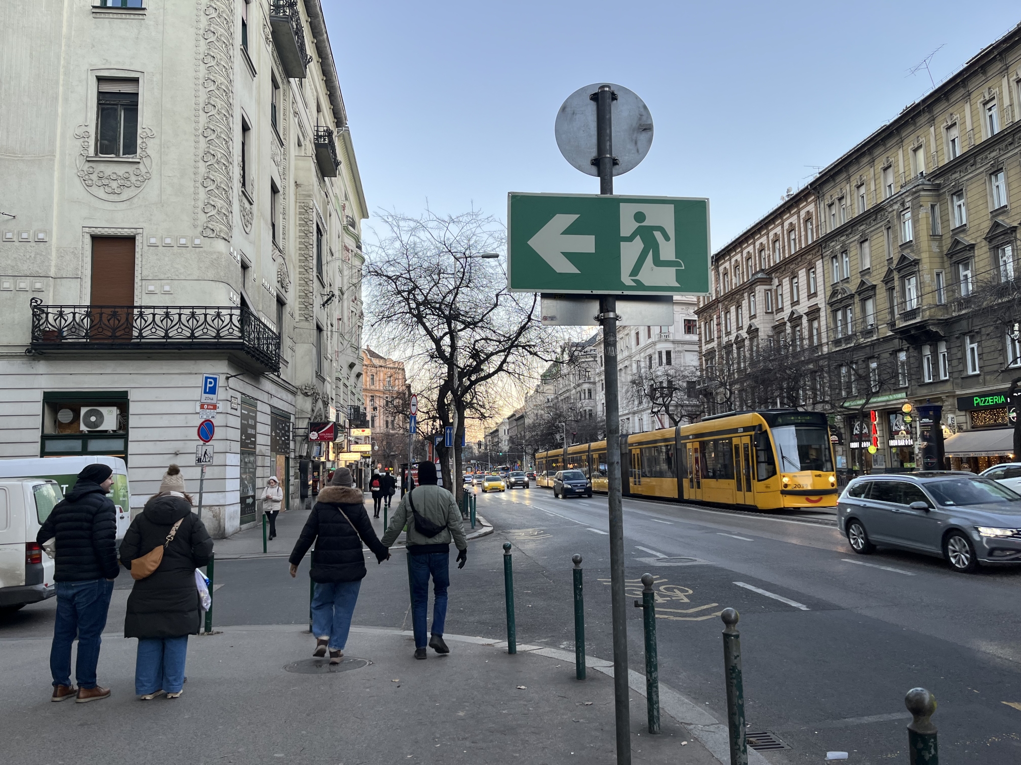 Valószínűleg a kisebbik októberi nagygyűlésről maradt kint ez a már felesleges “vészkijárat” tábla a Szent István körút és Tátra utca sarkán.