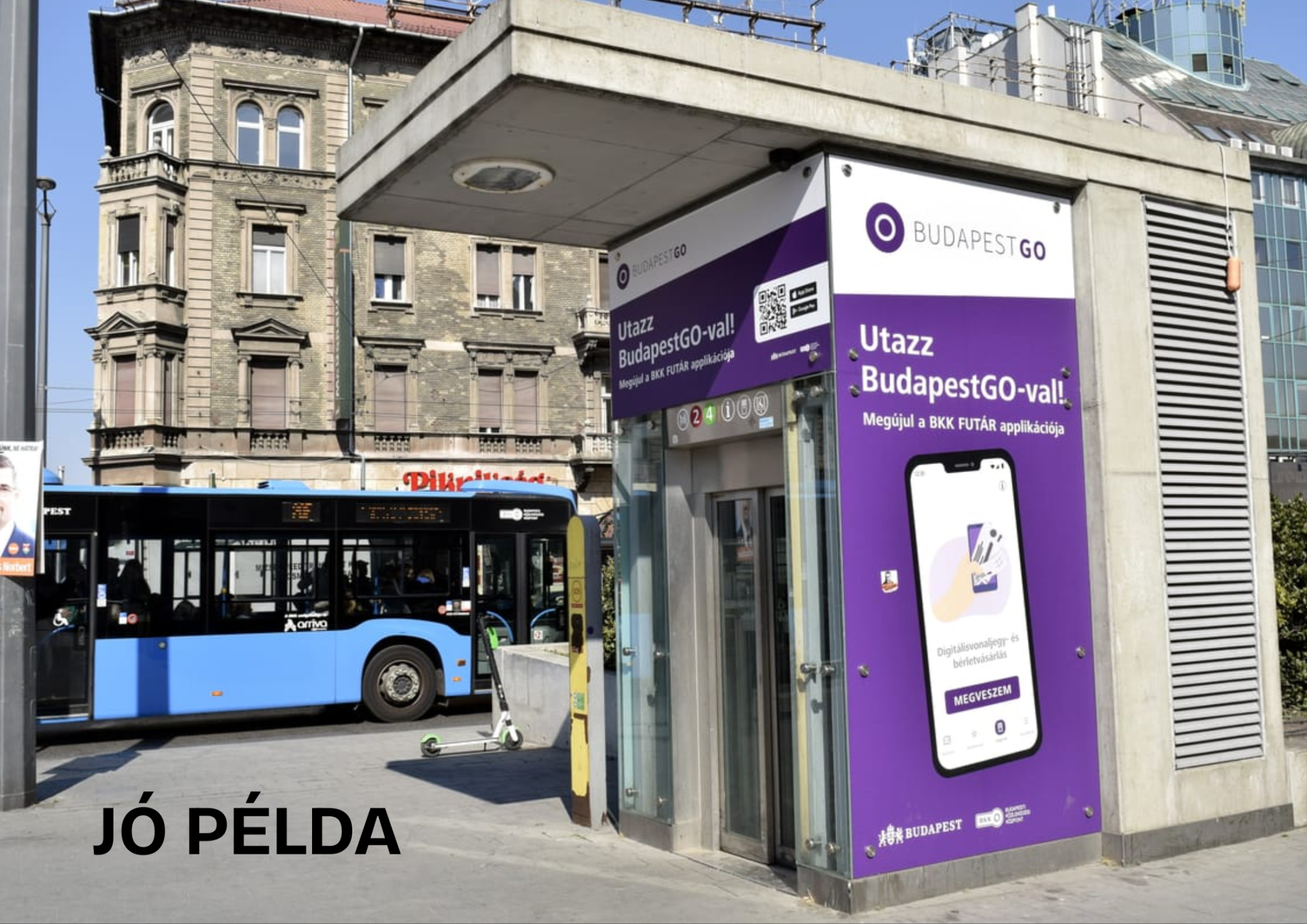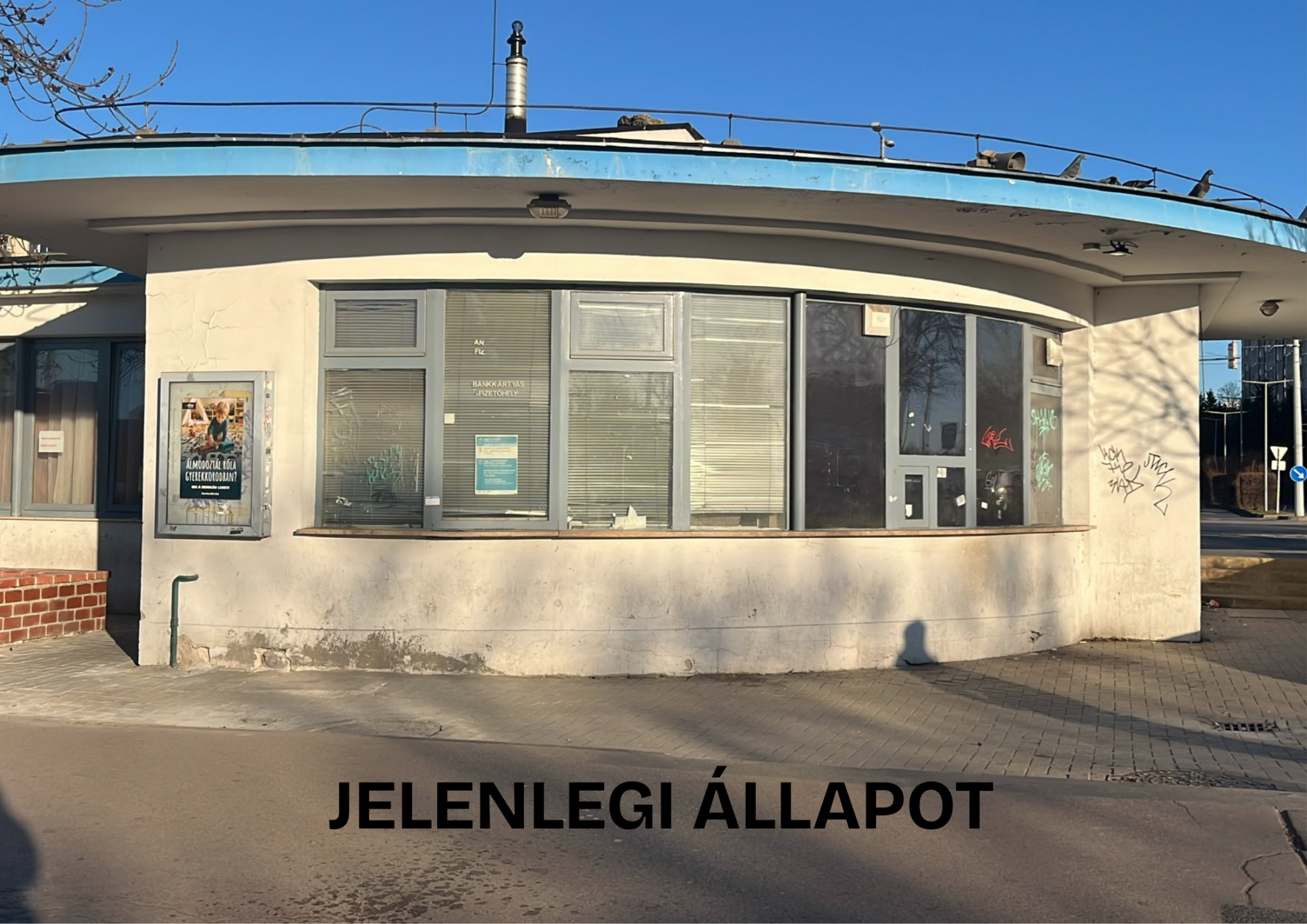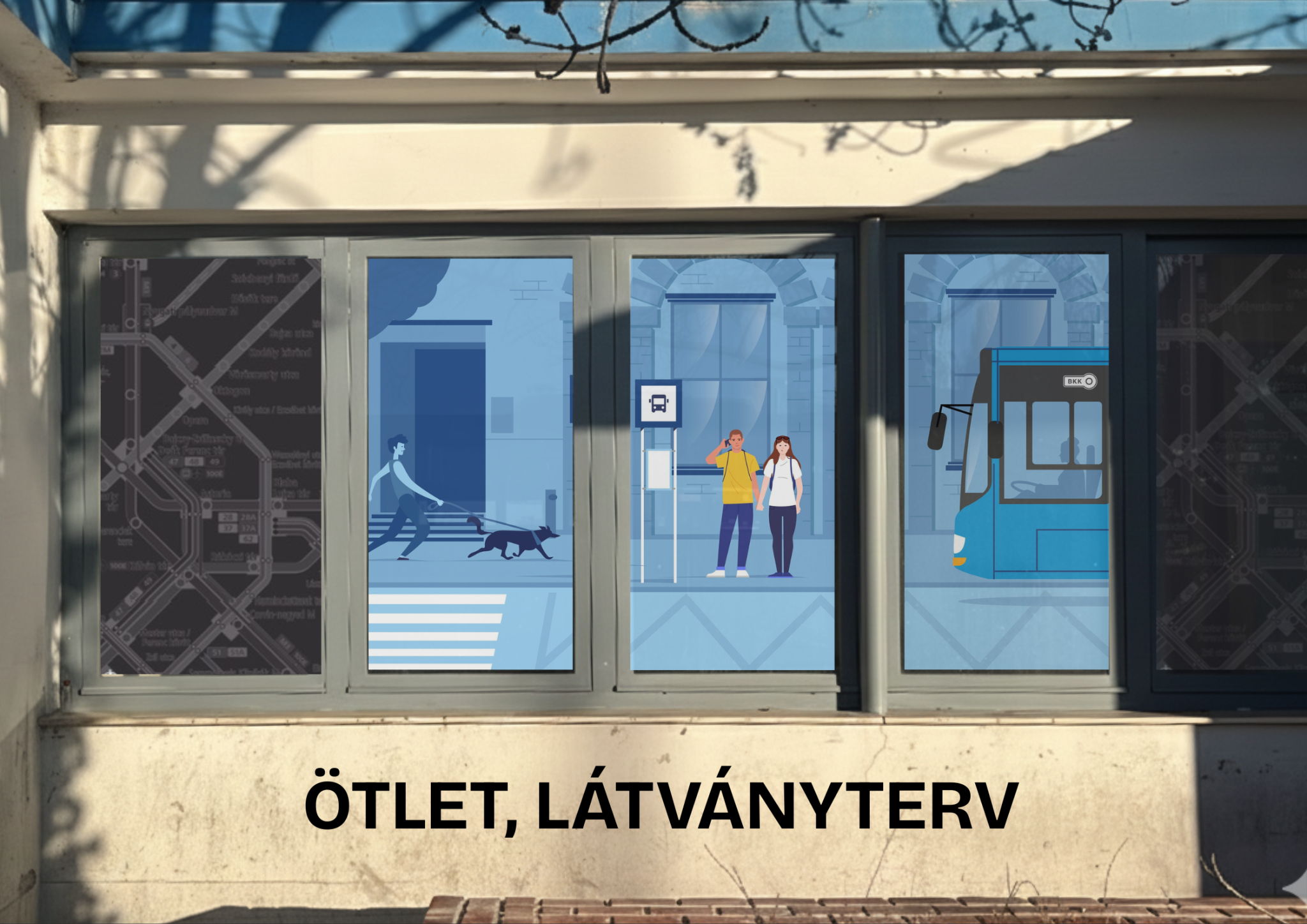 Egy ekkora köztér karbantartása több szereplőn múlik, de a jelzett épület tudtommal a BKK vagy a BKV üzemeltetésében áll. Ennek megfelelően szeretném javasolni, hogy, mint a mellékelt illusztrációkon megtekinthetik, matricázzák fel az ablakokat. Az ablakmatricákon szerepelhetnének utazási információk/feltételek, térképek, BudapestGO reklám, a BKK különféle kampányainak vizuális anyagai (Összehozzuk a várost, stb.).