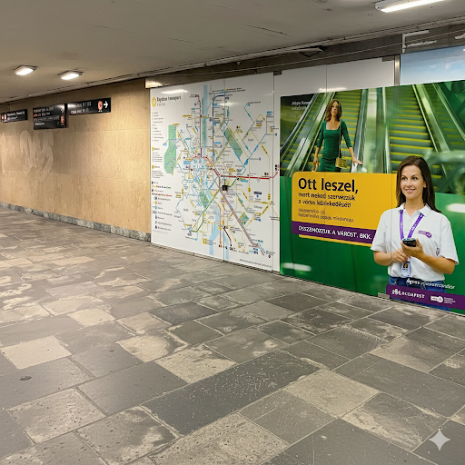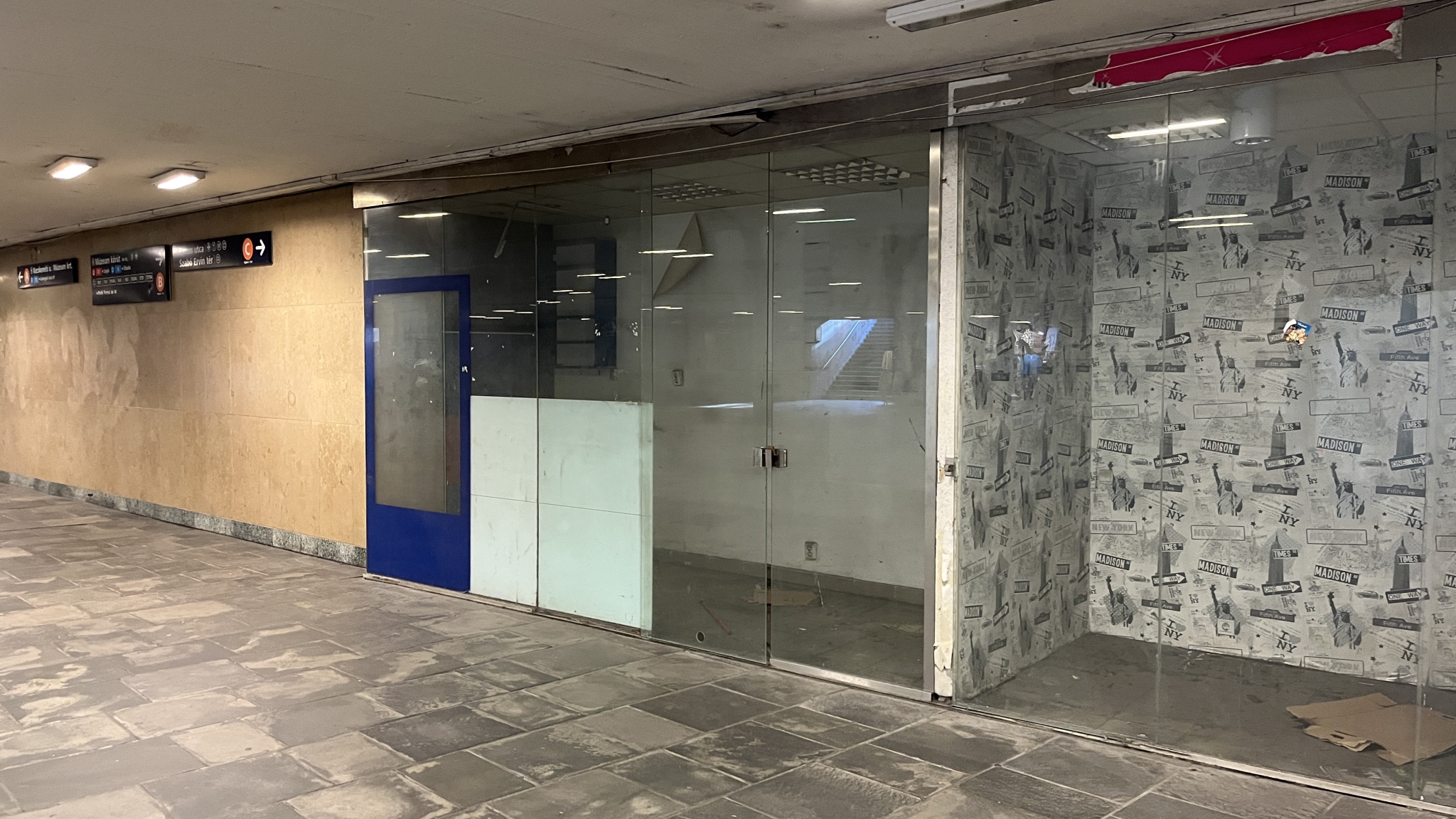A Kálvin téri aluljáróban vagy 3 üzlethelyiség tátong üresen, de az üvegen keresztül látható az egykori üzletek tere. Esztétikai okokból szeretném kérni az üzlethelyiségek üvegeinek lefóliázását, matricázását. Lehetne itt vonalhálózati térkép, BKK-s reklám, stb., ld. a mellékelt látványtervet.