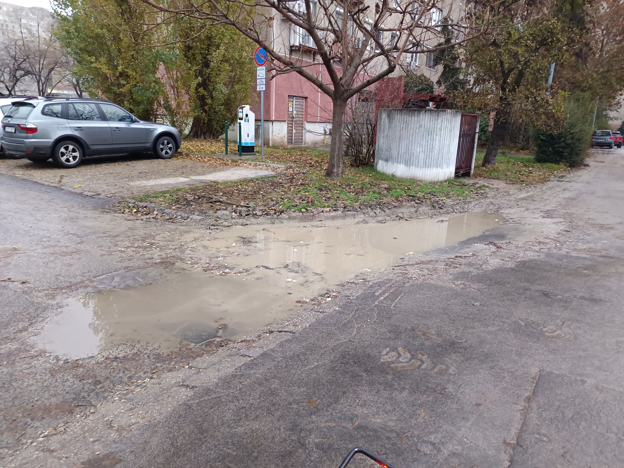 A Bebo K. (Zsirai M.) utca végén - valószínűleg a közműfelújítás kapcsán - az autók kijárták a kanyarban a földet. Most a legkisebb eső estén is sártenger folyik le az utca aljáig.