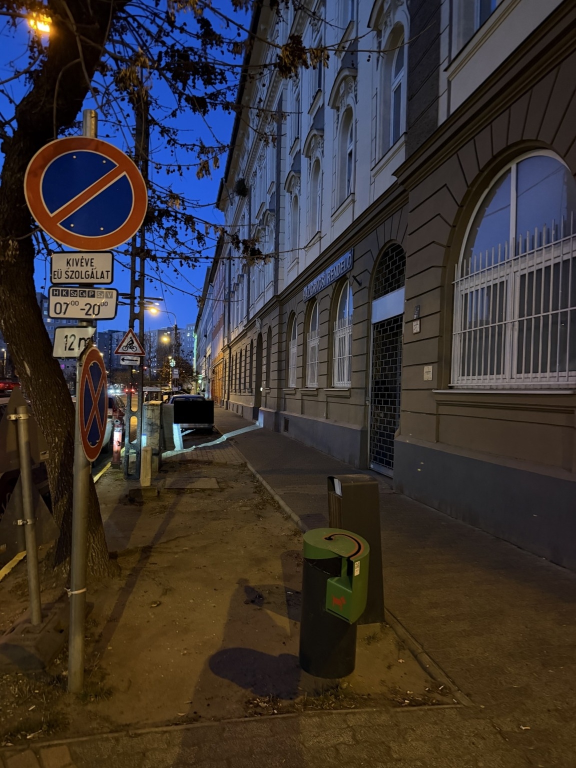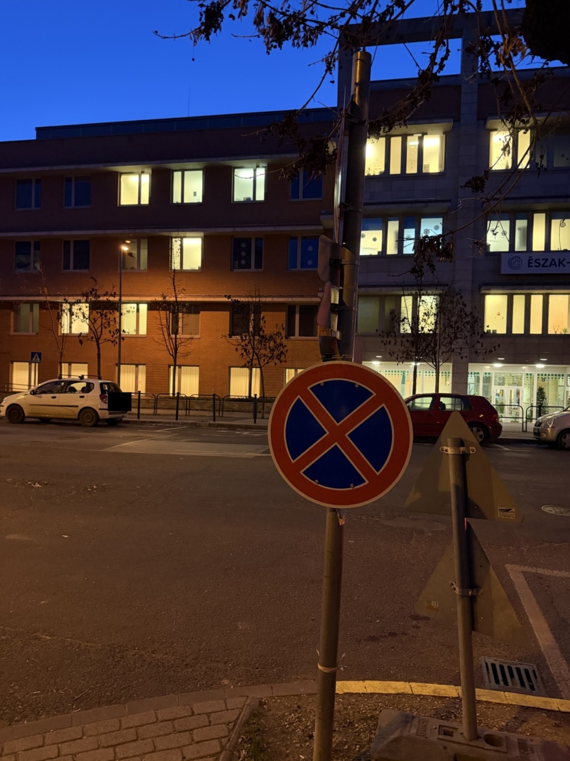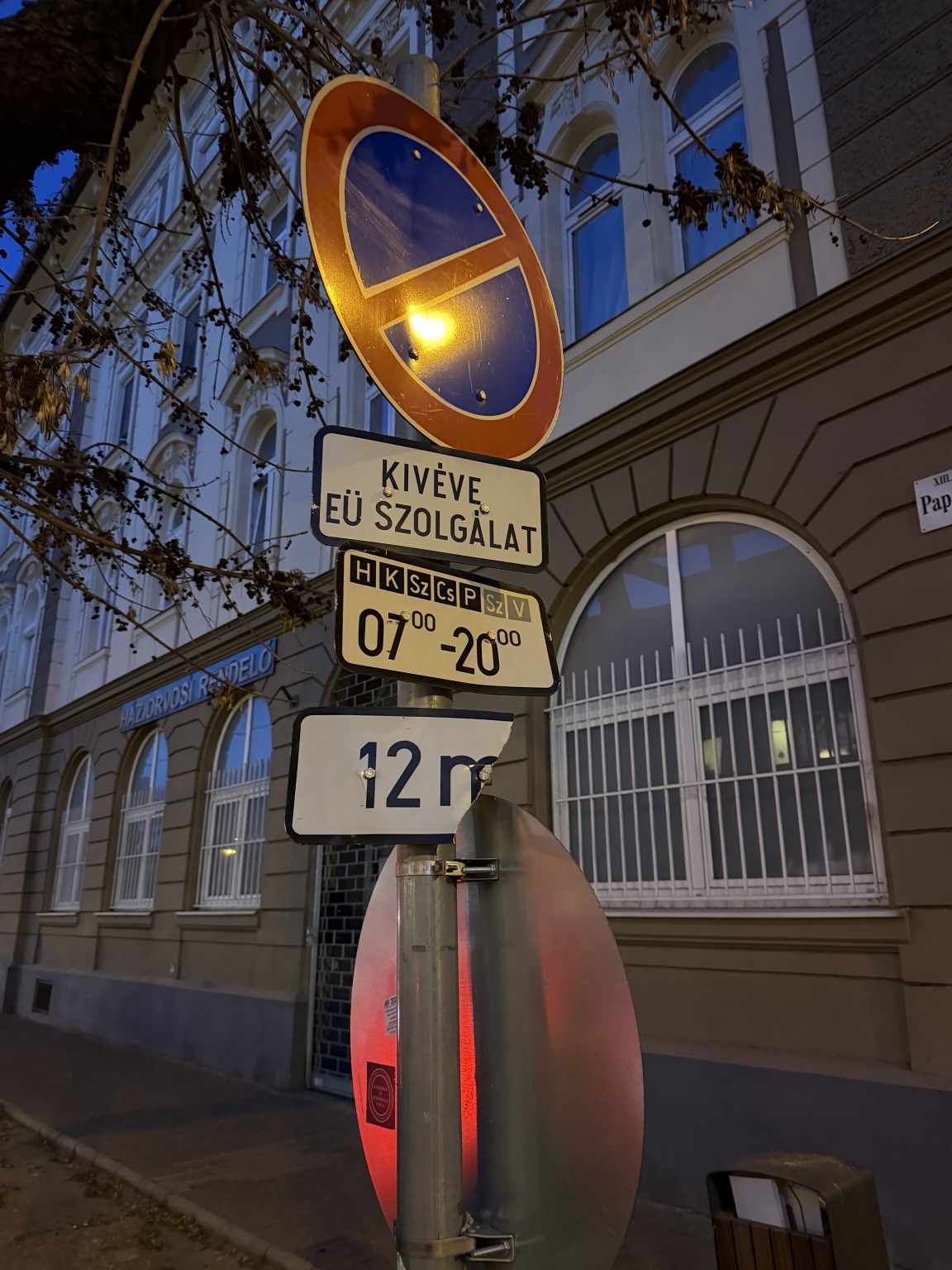 A Pap Károly utcában, a Csongor utca torkolatnál van egy kresztábla erdő. Itt aztán minden van. Megállni tilos eltekeredve, várakozni tilos megfaragott kiegészítőkkel. Van kettő veszélyt jelző is. A szegélykő is festve van, az folyamatos sárga, tehát a megállást tiltja.
