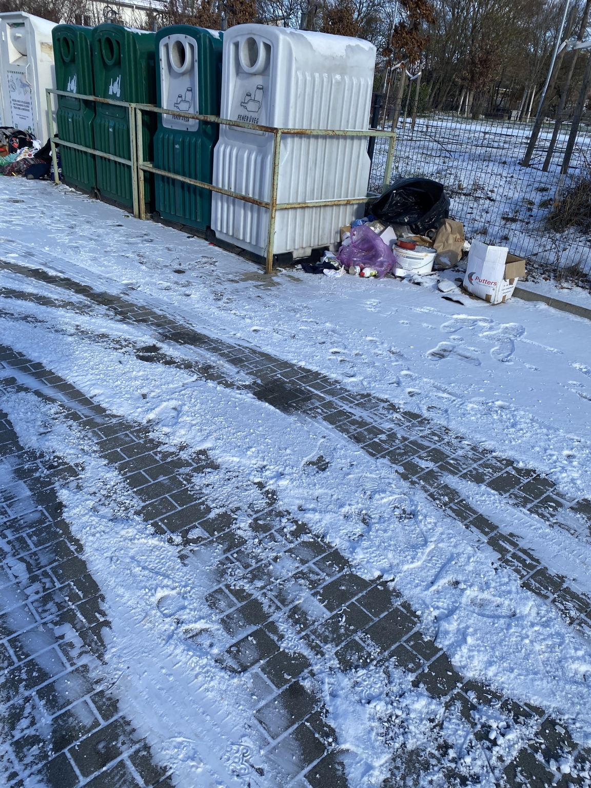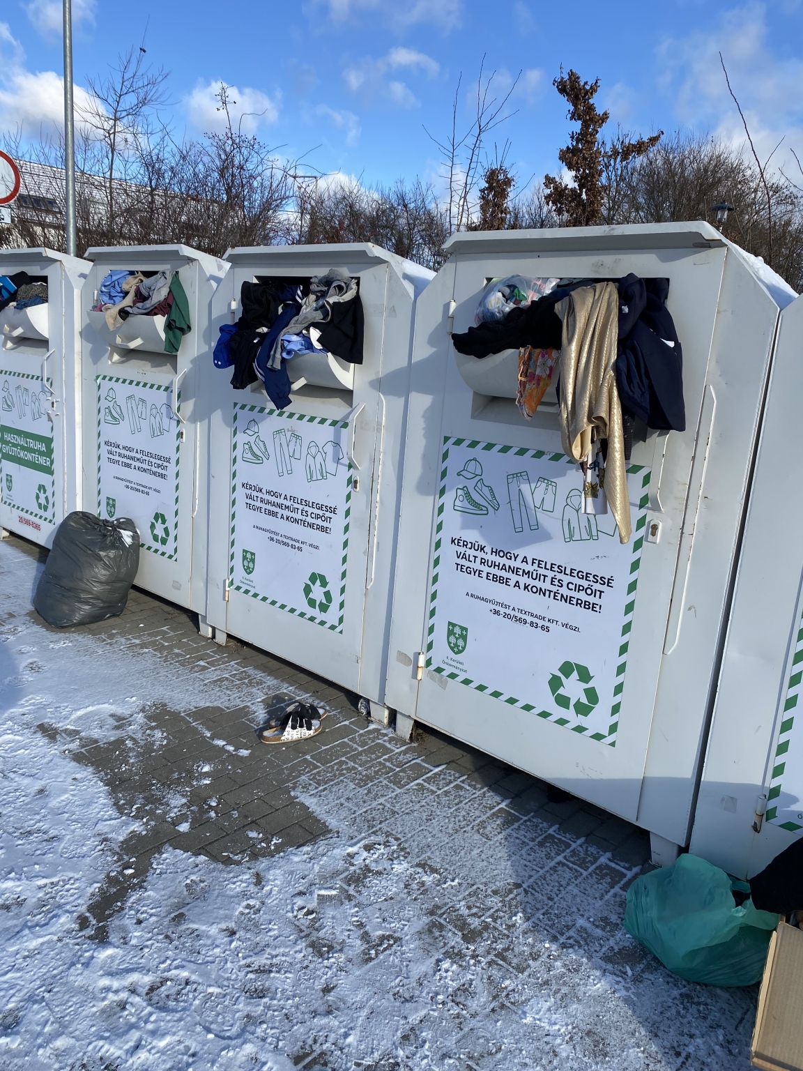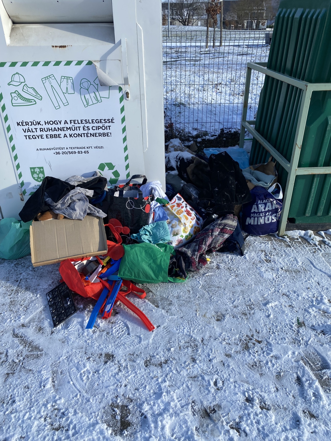 A ruhagyűjtő konténer környezete ismét elfogadhatatlan állapotban van. A konténerek túlcsordultak, a nyílásokból ruhák ömlenek ki, a területet szétszórt textilhulladék és szemét borítja. A helyszín gondozása nyilvánvalóan elmarad.