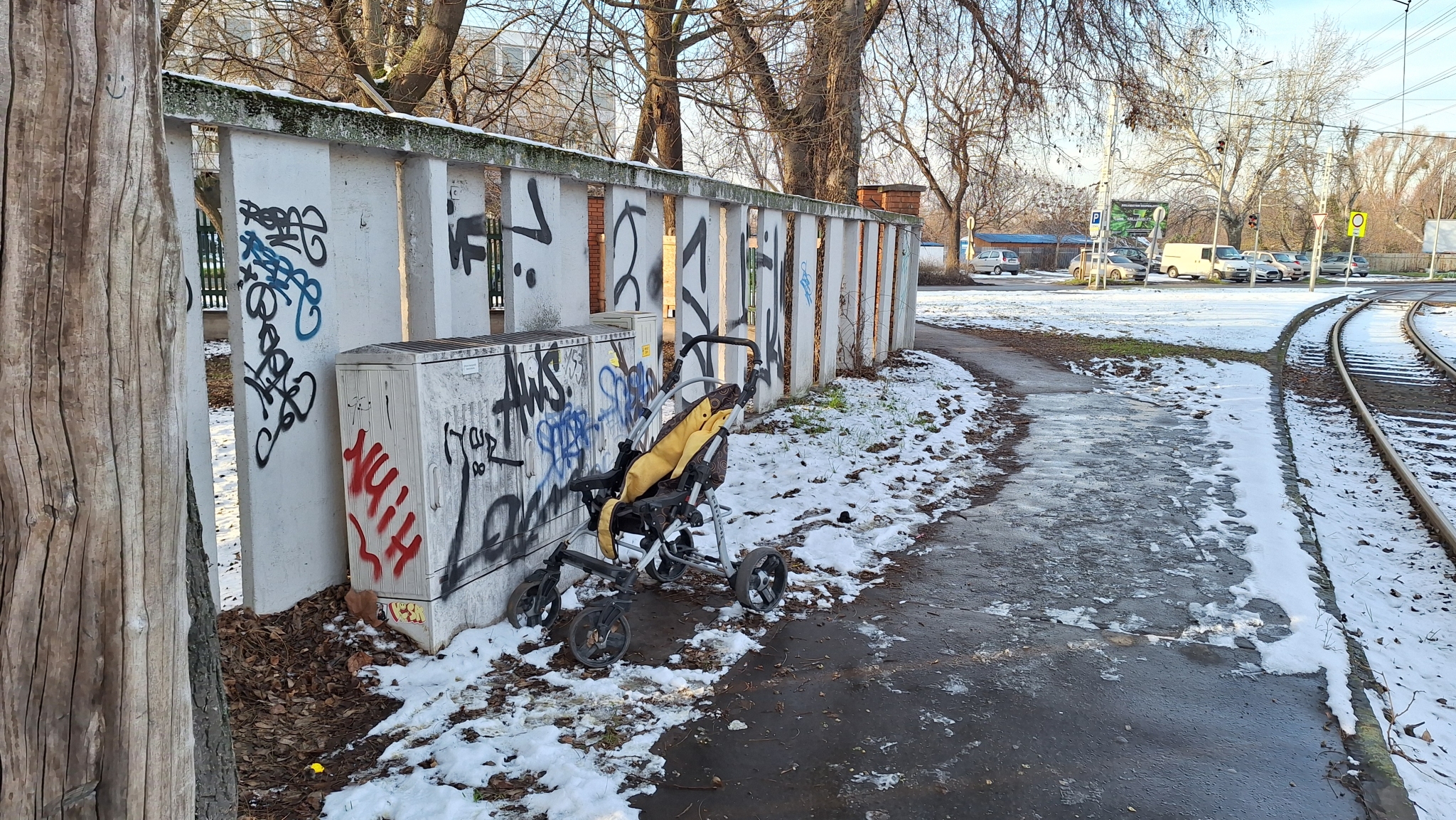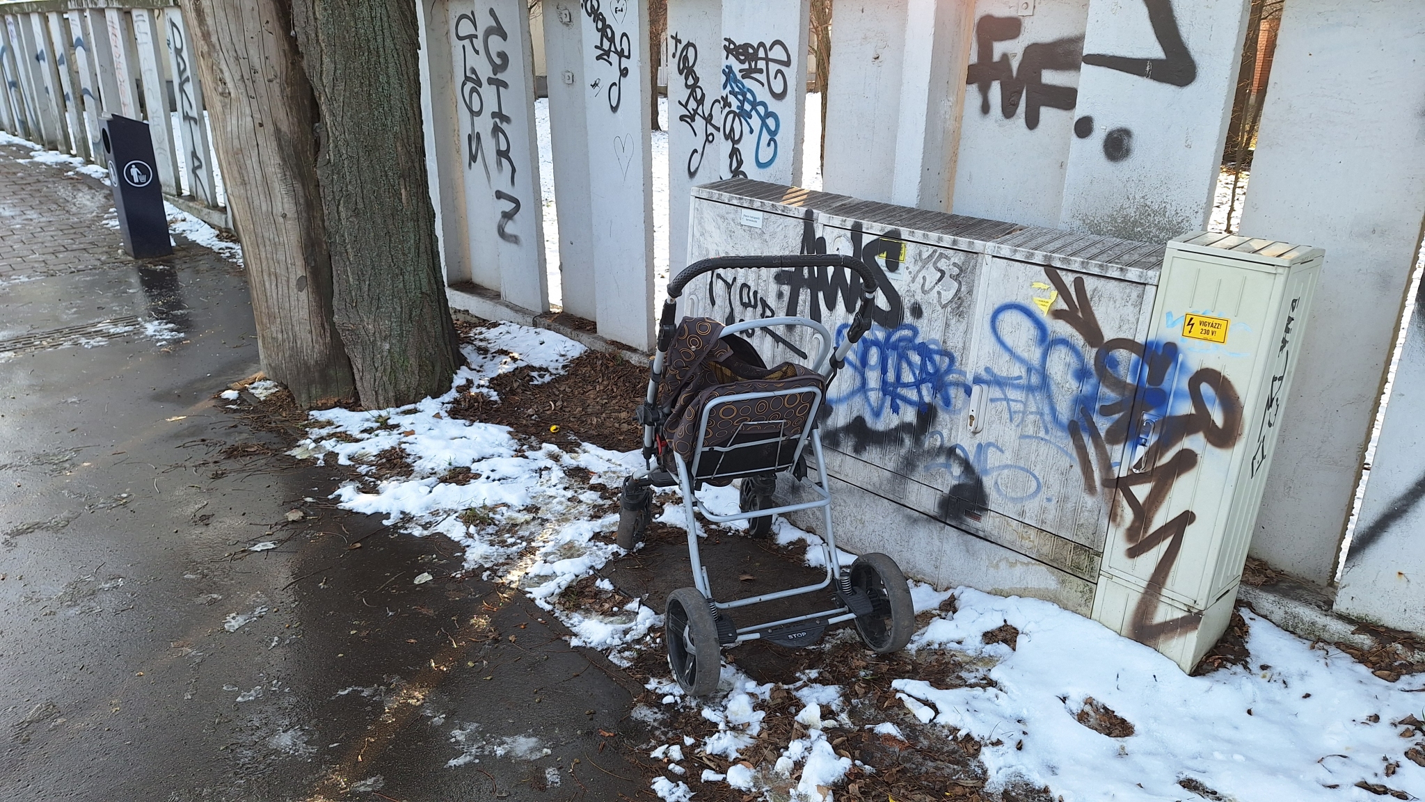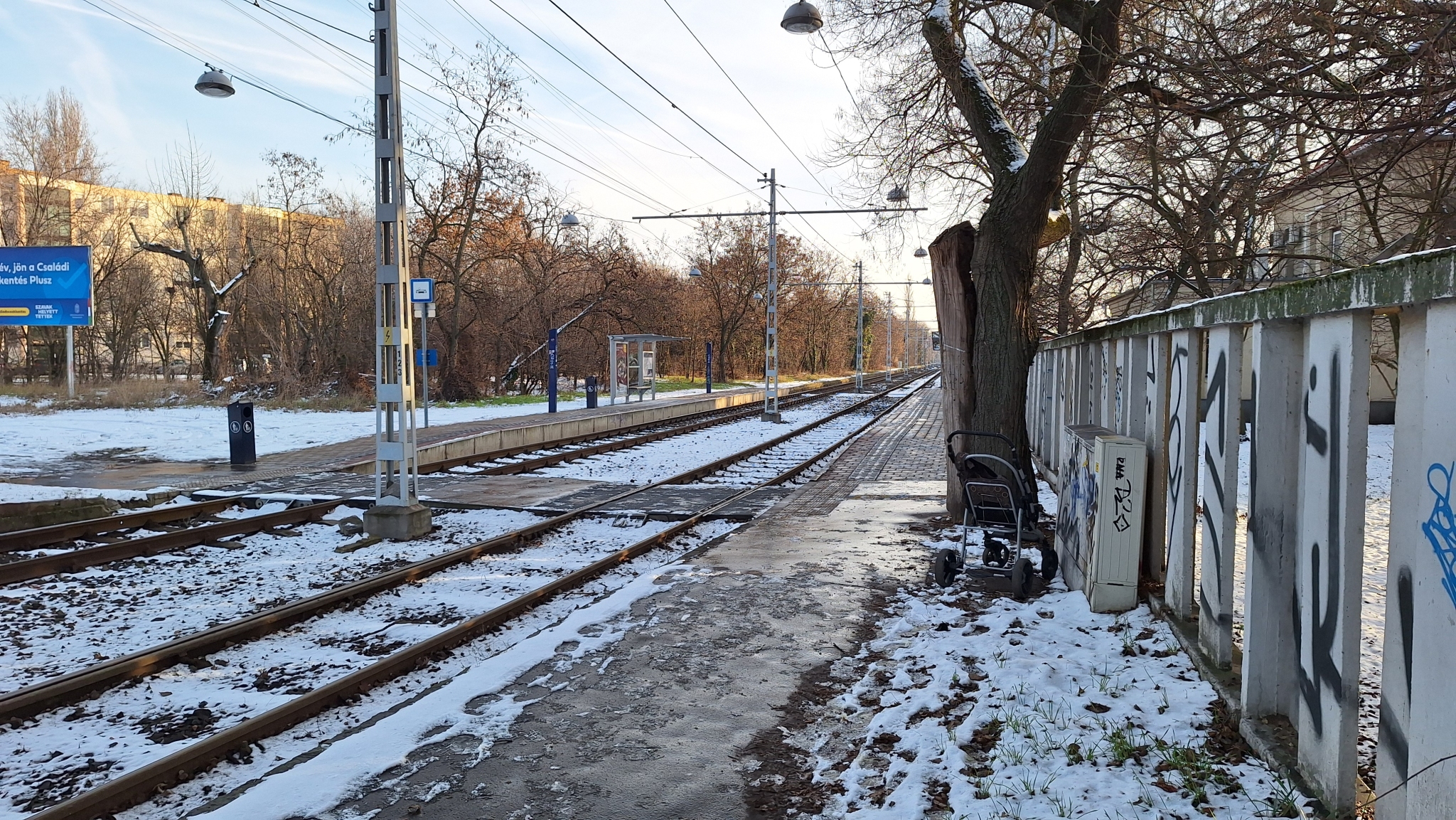 A 3-as villamos Közterületfenntartó Zrt. megállójában van egy elhagyott babakocsi.
