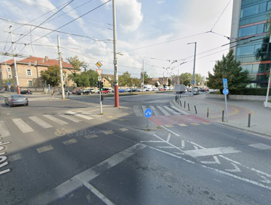 A Stadionok metrómegállónál, a Hungária körút és a Kerepesi út találkozásánál, a kerékpáros átvezetés mellett, a városból kifelé vezető irányban, a Kerepesiről a Hungáriára vezető kanyarodósávot az egyenesen haladó sávoktól elválasztó járdaszigetnél a haladási irányt jelző kis tábla teljesen a földre hajlik.