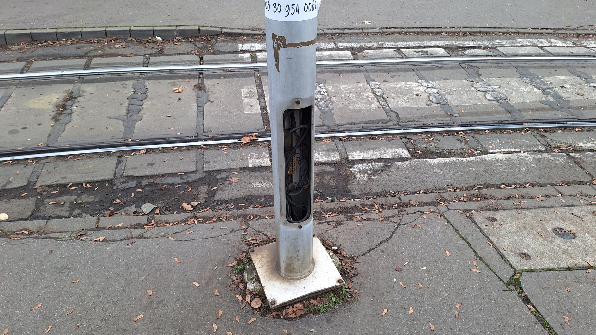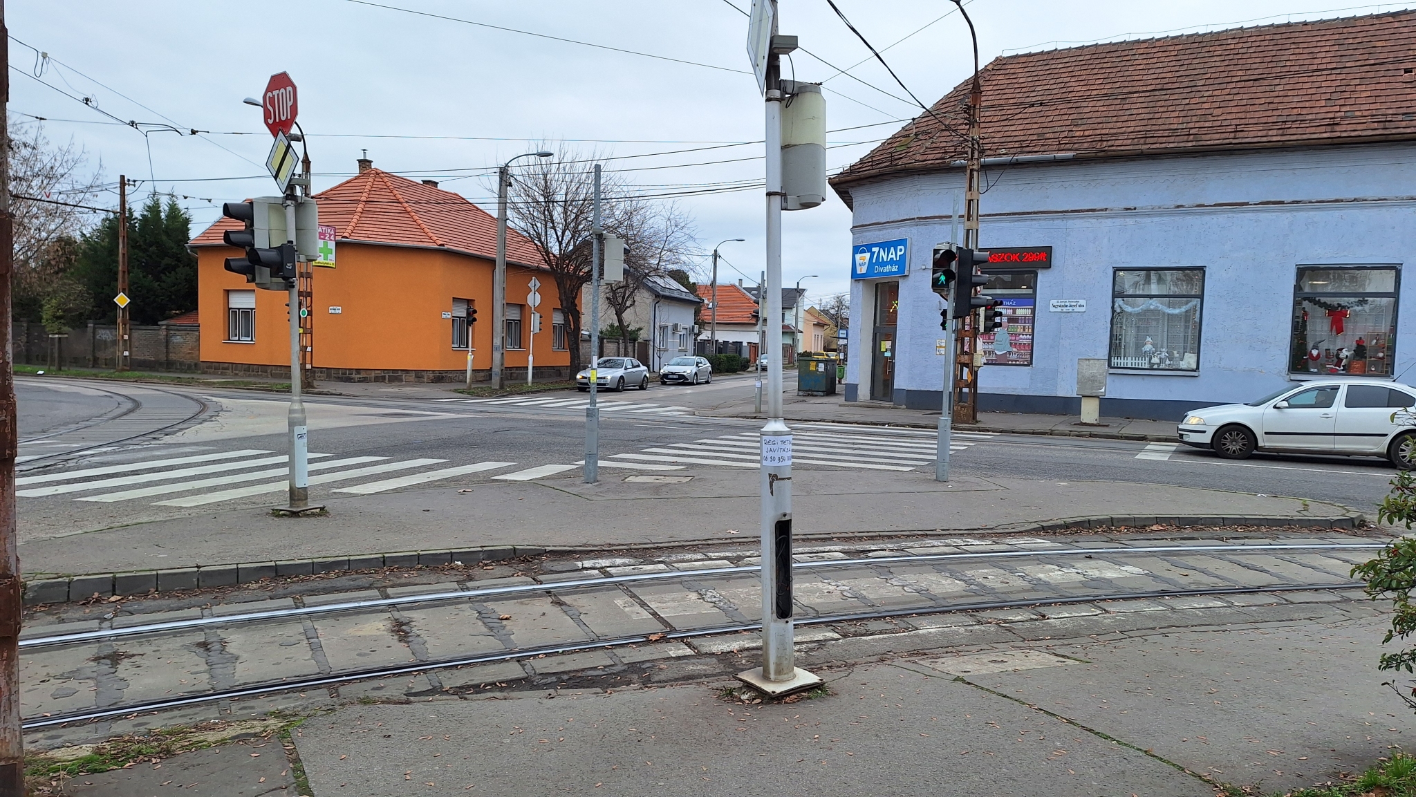 A Nagysándor József és Török Flóris utca sarkán álló egyik jelzőlámpaoszlopnak hiányzik az oldalsó fedele.