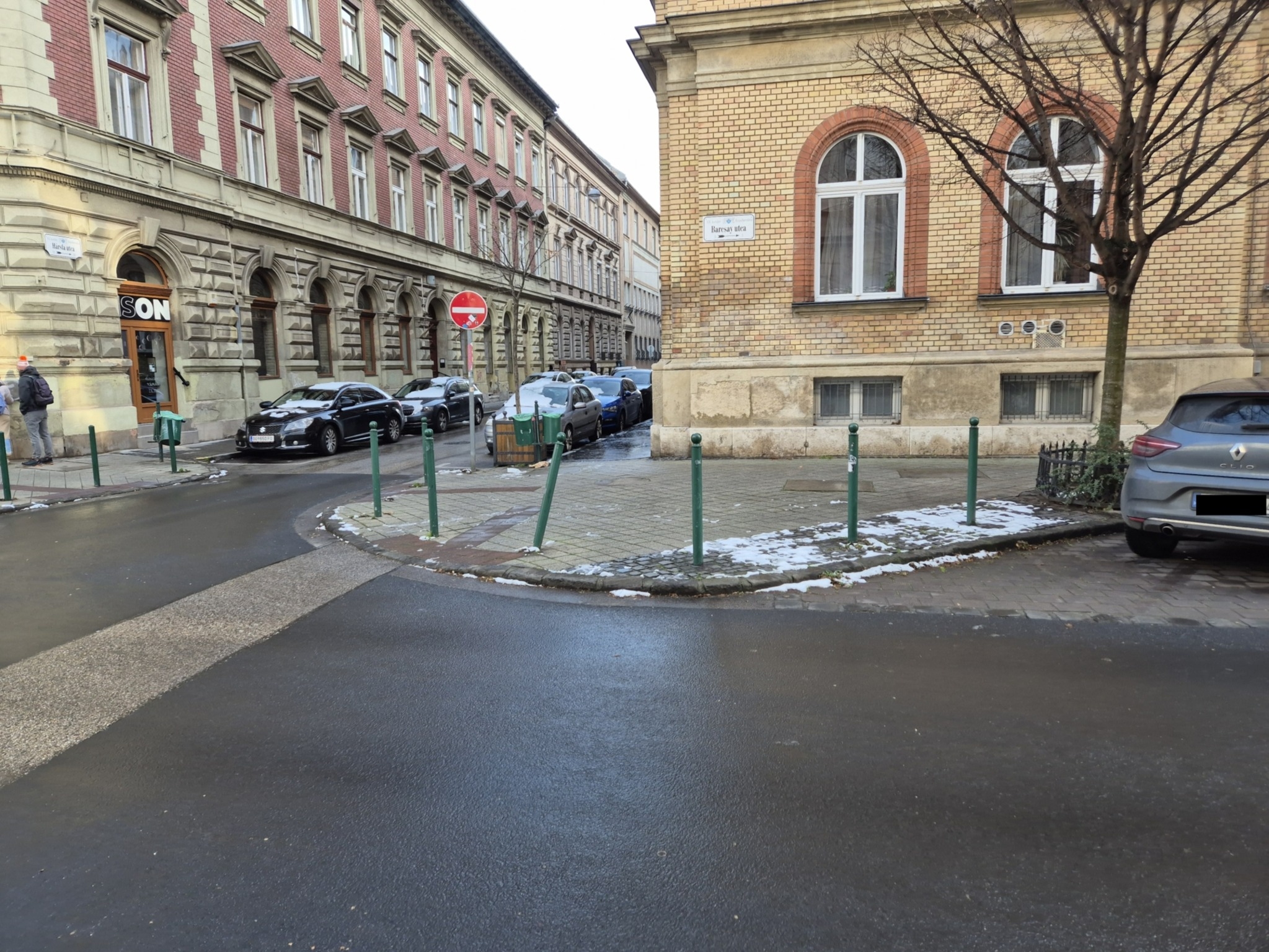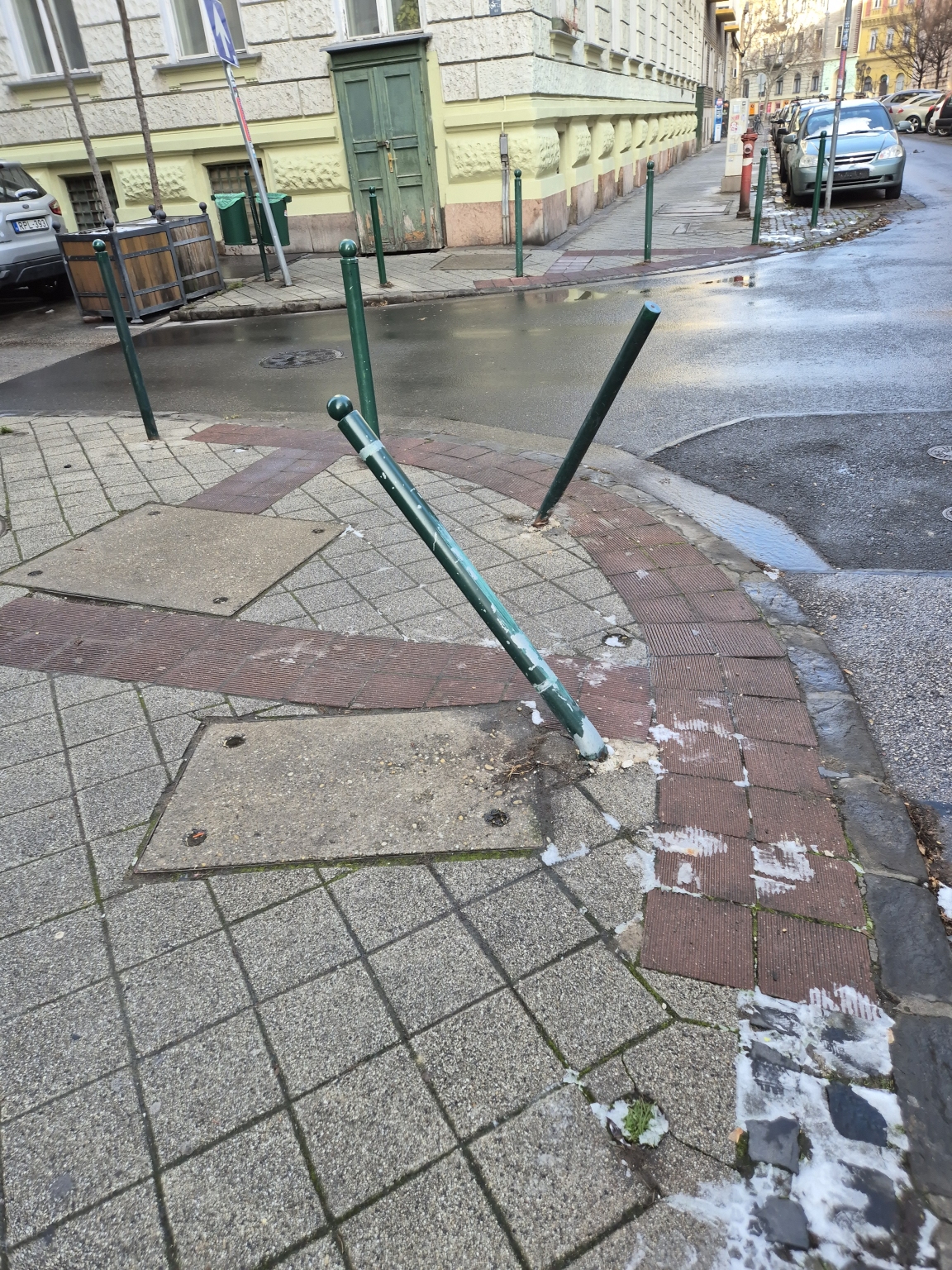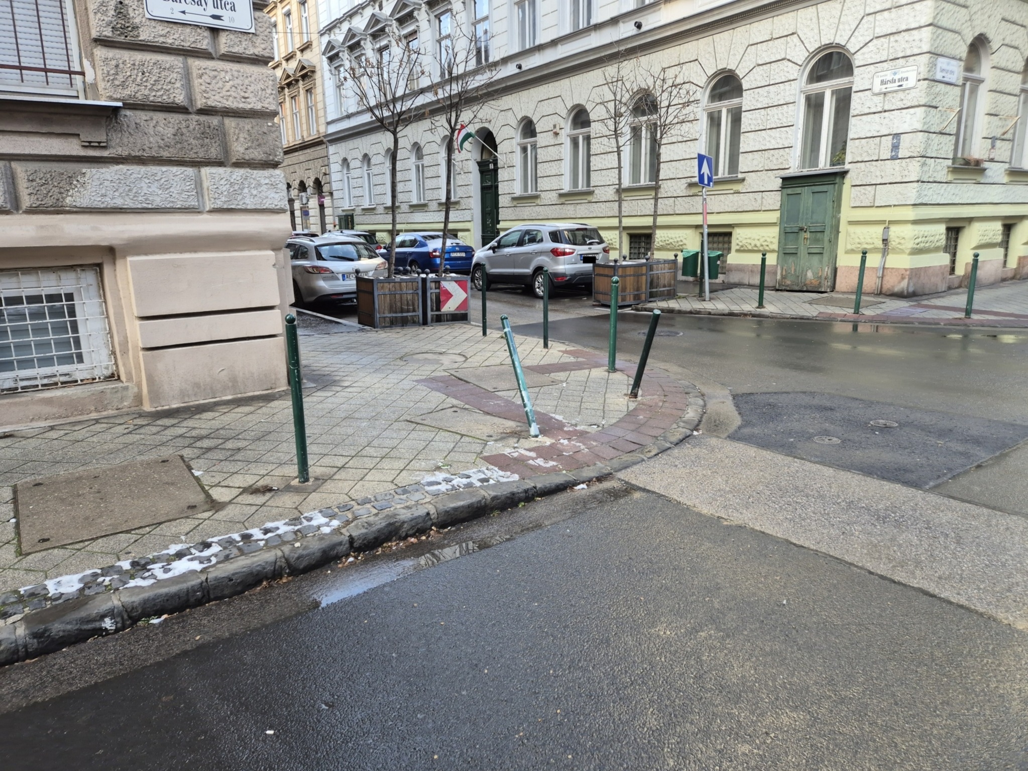 A Barcsay utca és a Hársfa utca sarkán a járdát az autós forgalom elől elzáró karók vagy hiányoznak, vagy ki vannak döntve. Kérem cseréljék le, illetve pótolják be őket. Köszönöm munkájukat! :)