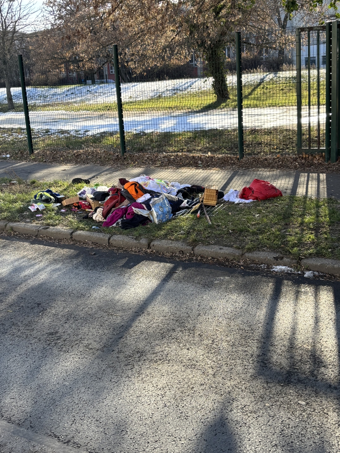 Újpest Berda József utca 14 házszám előtt ruhaneműk, szemét, lomok lerakása!!!