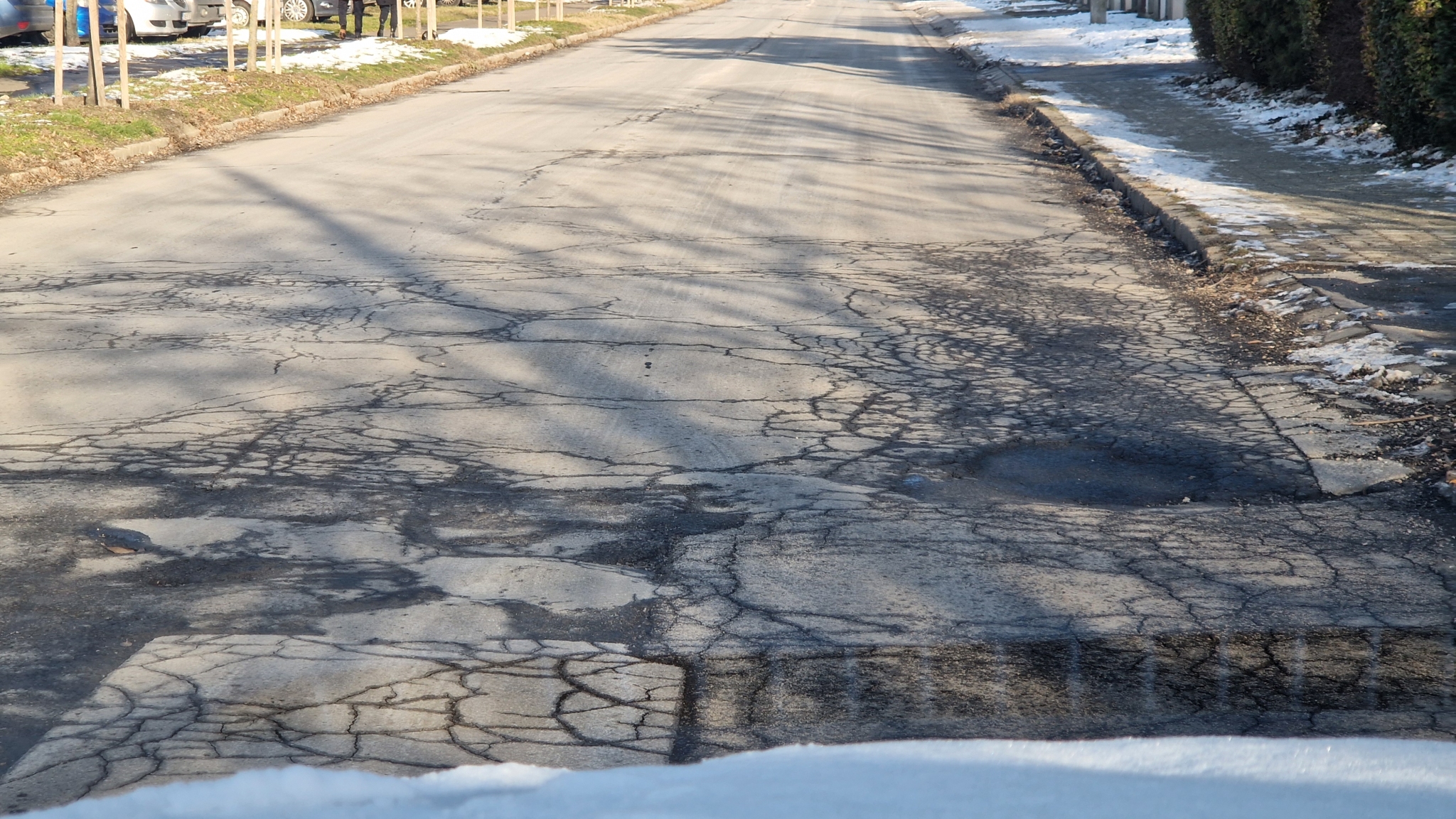 Kátyú,ami sunyibb, mint ahogy látszódik. Egy vékonyabb gumival simán defekt.