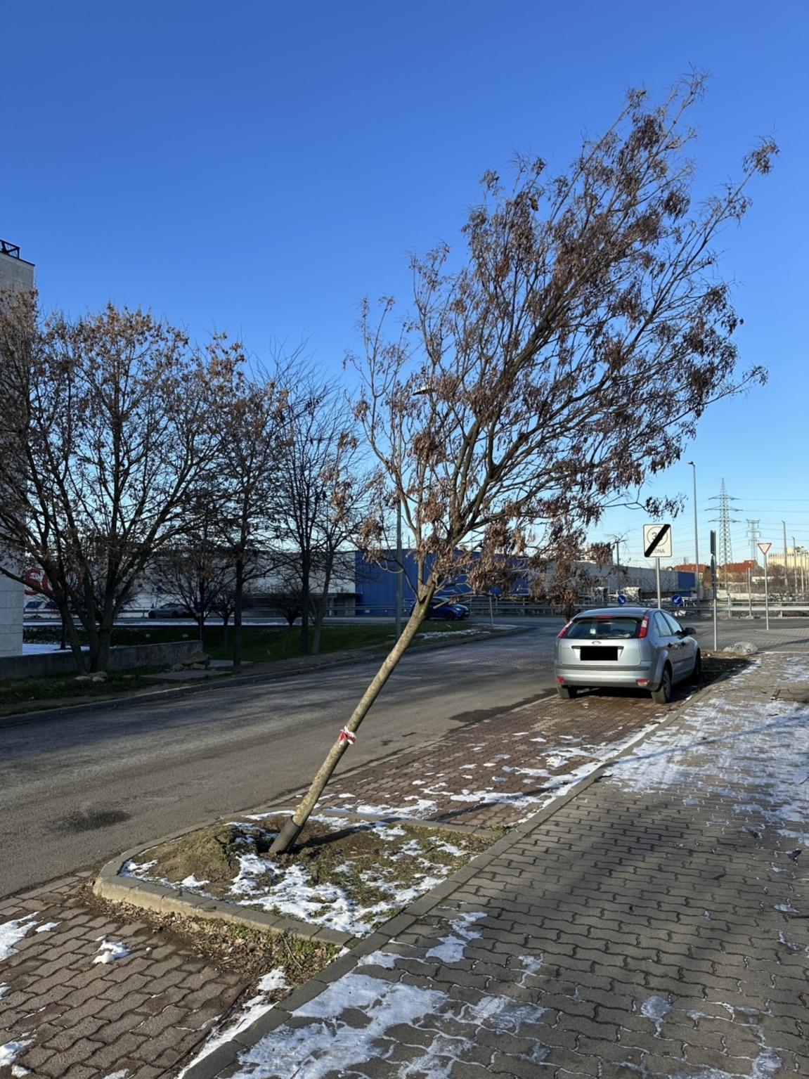 A Tomori és Juta utcák találkozásánál az egyik fa a járda felé elkezdett kidőlni. Korrigálás nélkül félő, hogy teljesen ki fog szakadni a talajból.