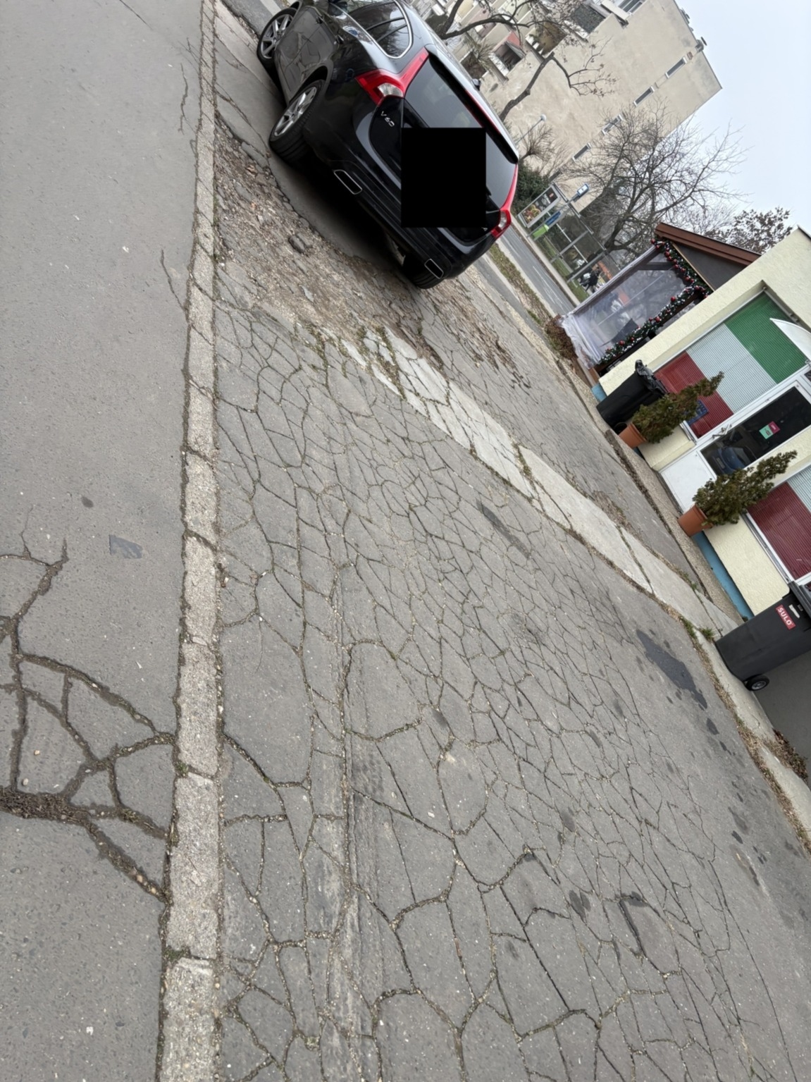Szörnyű állapotban levő járda és parkoló az üzletek előtt.