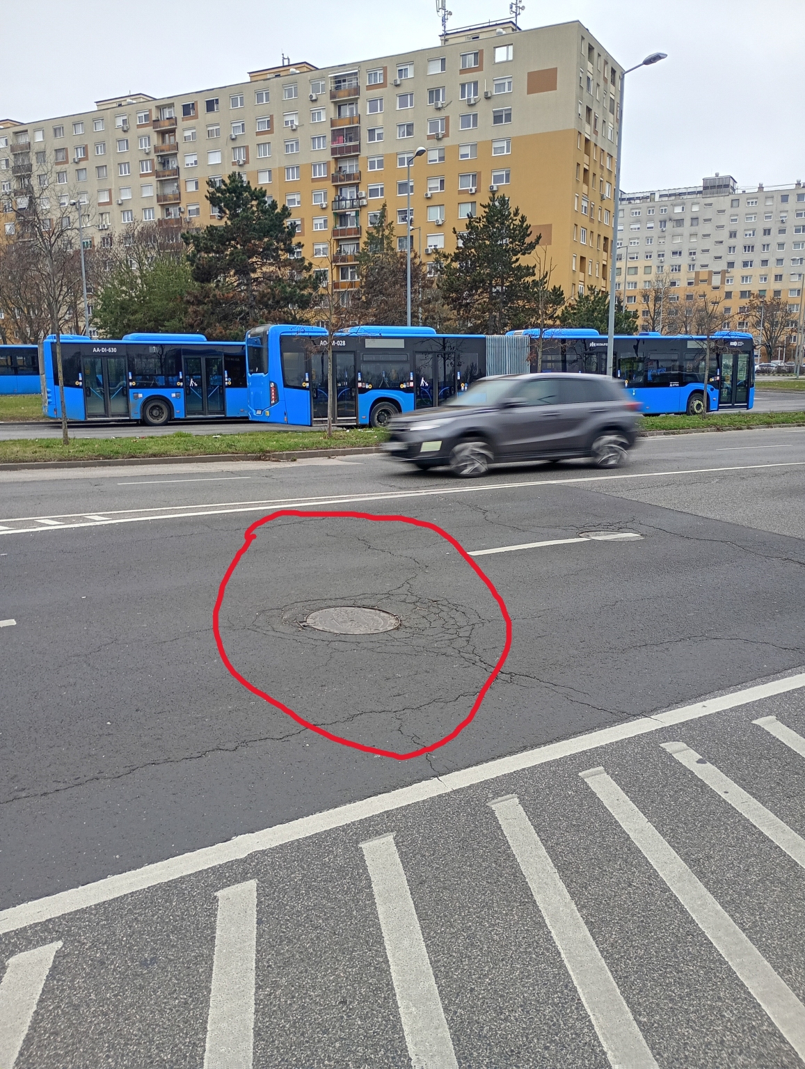 Kérem az illetékest, hogy a képen látható, megsüllyedt aknafedelet legyenek szívesek az aszfalttal egy szintbe hozni!