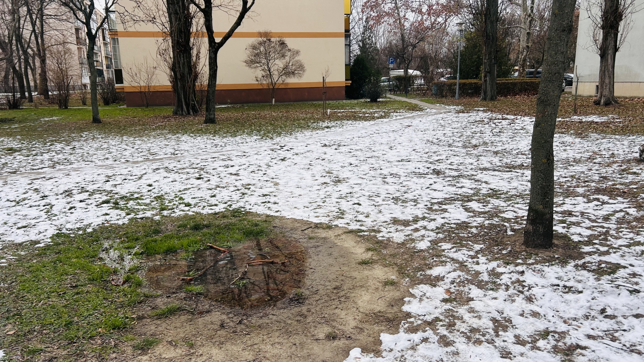 A parkban két epulet között lassan de láthatóan bugyog a viz a földből.