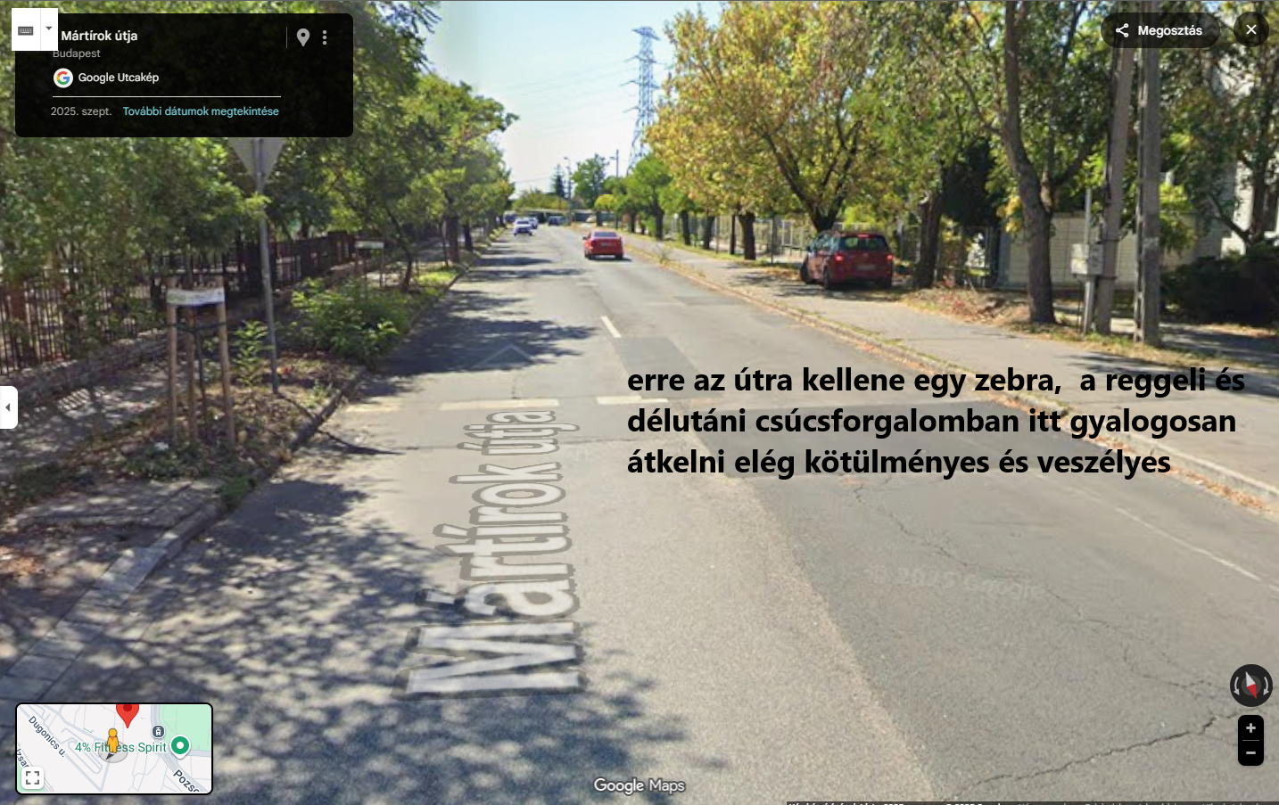 Üdv, a probléma a következő: Újpesten a Mártírok útja Berda József utca és Dugonics utca közötti szakaszán a gyalogos átkelés zebra hiányában kihívásokkal teli, a reggeli és délutáni csúcsforgalomban (amikor a legtöbb a gyalogos és az autós is) pedig majdhogynem lehetetlen. Sok esetben, amikor már percek óta vár az ember, egyszerűen kénytelen lelépni a mozgó autók elé, máskülönben még 20 percig várhatna, amíg az autók között lesz egy akkora foghíj, hogy biztonságosan át tudjon menni.