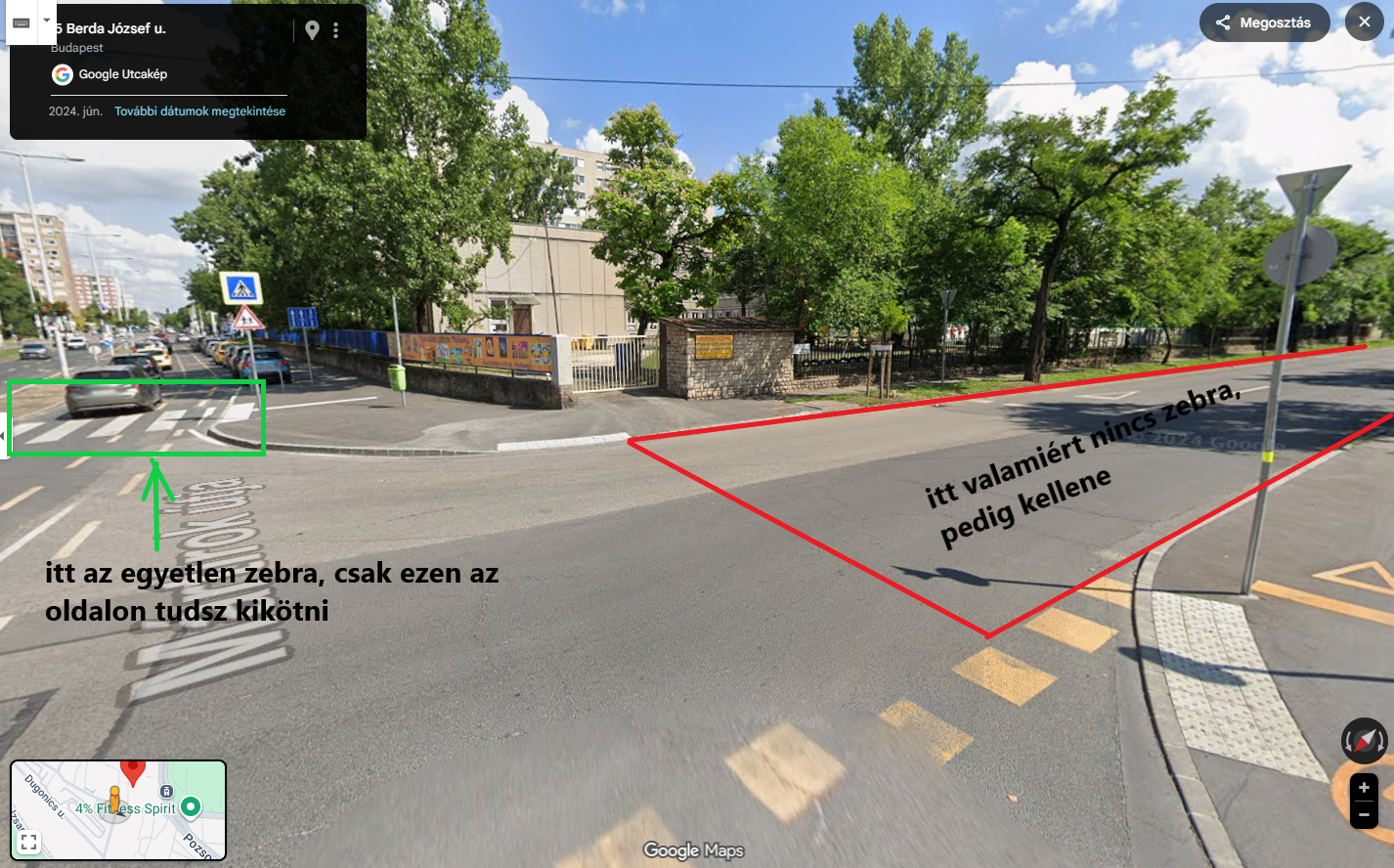 Egyrészt a Berda József utcán ugyan van zebra, de az csak a Mártírok útja általános iskola felőli oldalán van, így csak azon az oldalon tudsz kikötni, az Autóklub felőli oldalán nem. Ha az ember mégiscsak az Autóklub oldalán szeretne kikötni (ahol többek között egy elég forgalmas csomagátvevő automata is van) akkor ezt a KRESZ szabályait megszegve teheti csak meg, vagy a Mártírok útján lépve le az autók elé, vagy pedig a még forgalmasabb Berda József utcán.