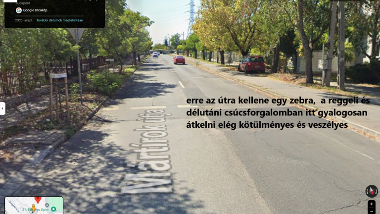 Üdv, a probléma a következő: Újpesten a Mártírok útja Berda József utca és Dugonics utca közötti szakaszán a gyalogos átkelés zebra hiányában kihívásokkal teli, a reggeli és délutáni csúcsforgalomban (amikor a legtöbb a gyalogos és az autós is) pedig majdhogynem lehetetlen. Sok esetben, amikor már percek óta vár az ember, egyszerűen kénytelen lelépni a mozgó autók elé, máskülönben még 20 percig várhatna, amíg az autók között lesz egy akkora foghíj, hogy biztonságosan át tudjon menni.