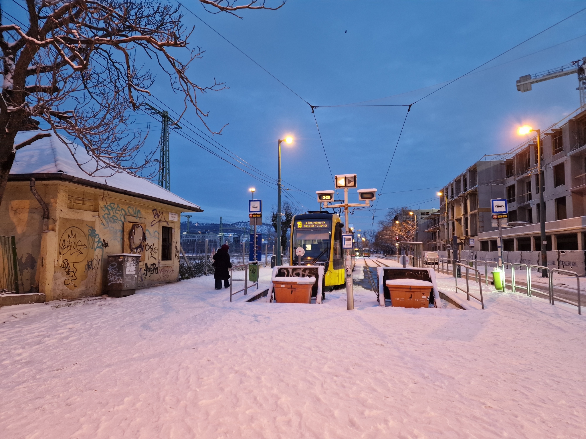 Az Etele tér 19-es villamos megállójában nincs eltakarítva a hó.