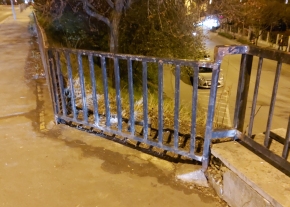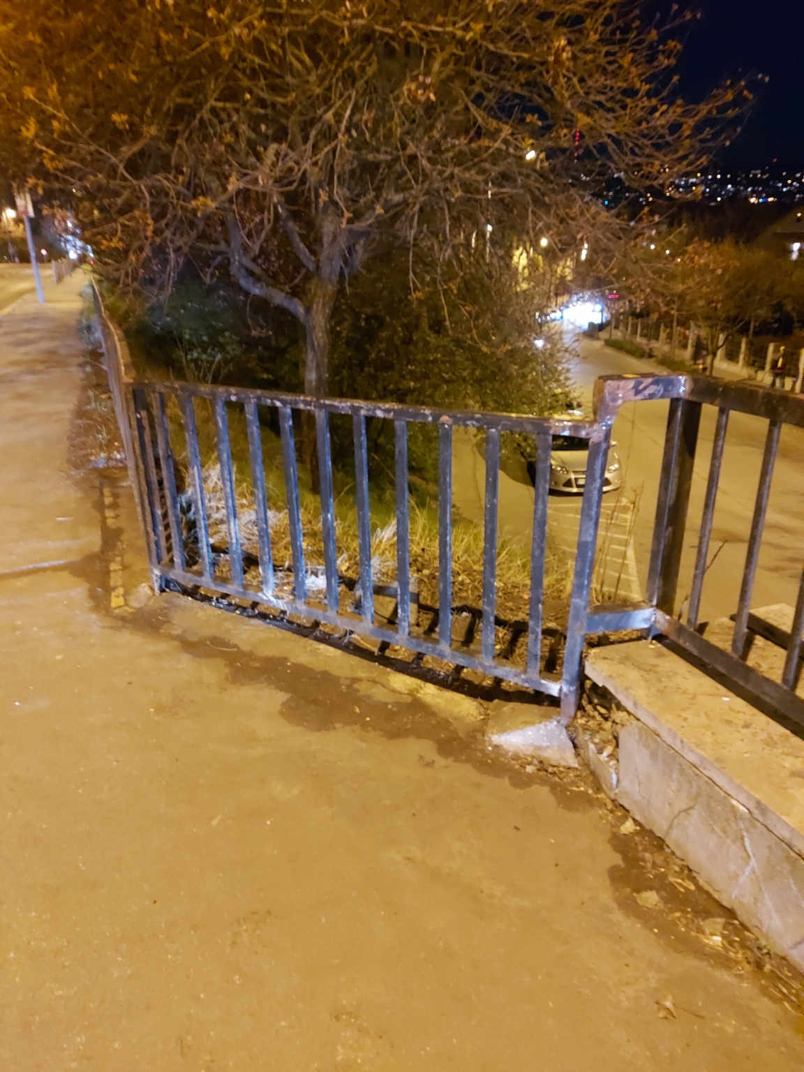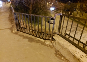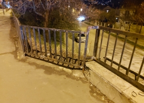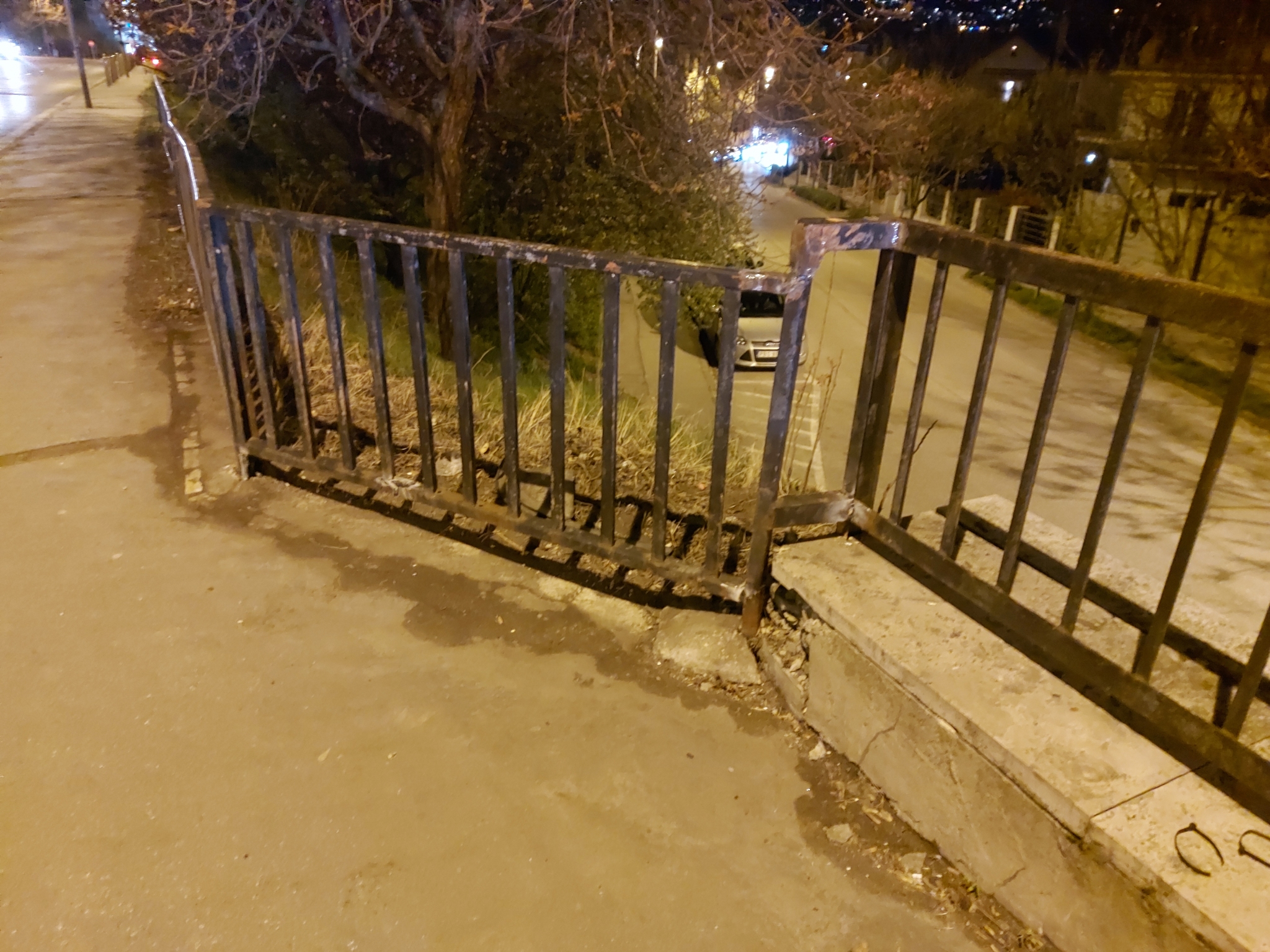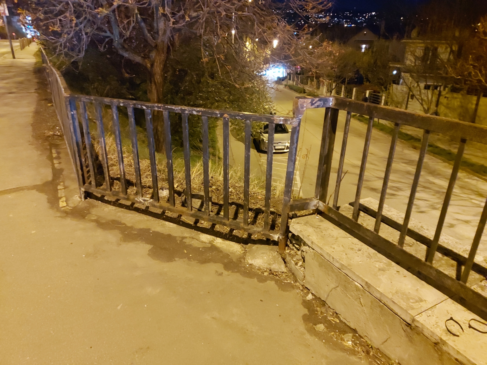 A Hegyalja úton az Aladár utca felőli meredek rézsű tetején lévő fekete fém kerítést feltehetően egy autó kidöntötte, megrongálta.