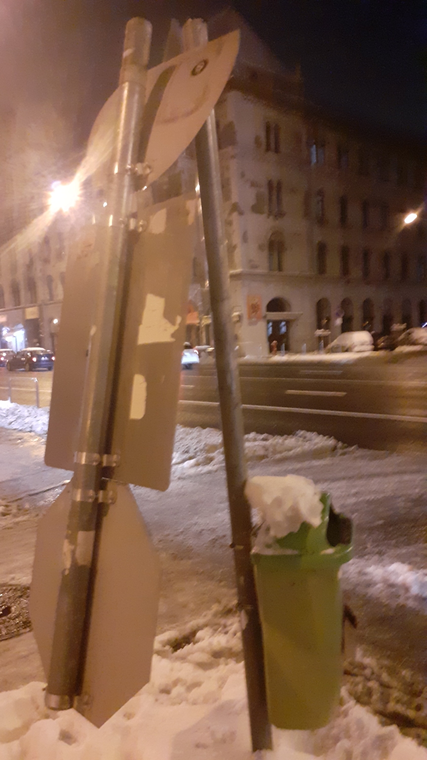 A sarkon álló közlekedési táblát félbe törték, így az veszélyt jelent, ha egy autós pl. nem veszi észre, hogy abba az utcába behajtani tilos.