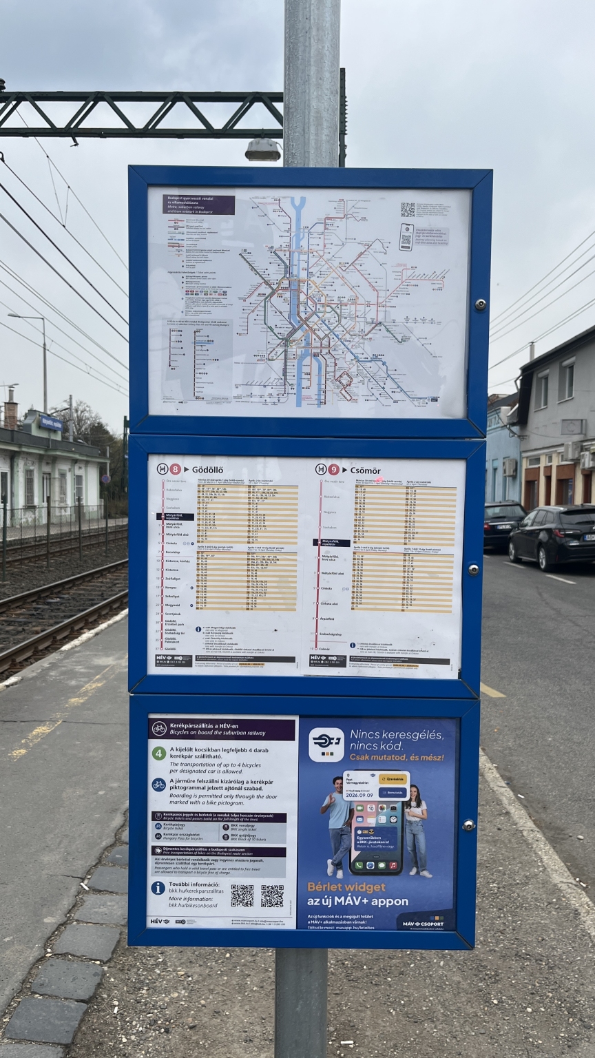 Mátyásföld, repülőtér HÉV-megállóban, a Gödöllő irányú peron elején van egy nagyon régi, fakó tájékoztató térkép. A régi MÁV-HÉV logó szerepel rajta, illetve a cinkotai telebusz sem szerepel rajta. Kérem, akár már a karácsonyi menetrend eltávolításával egyidőben cseréljék ezt is.