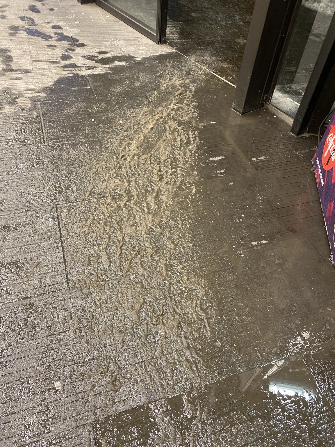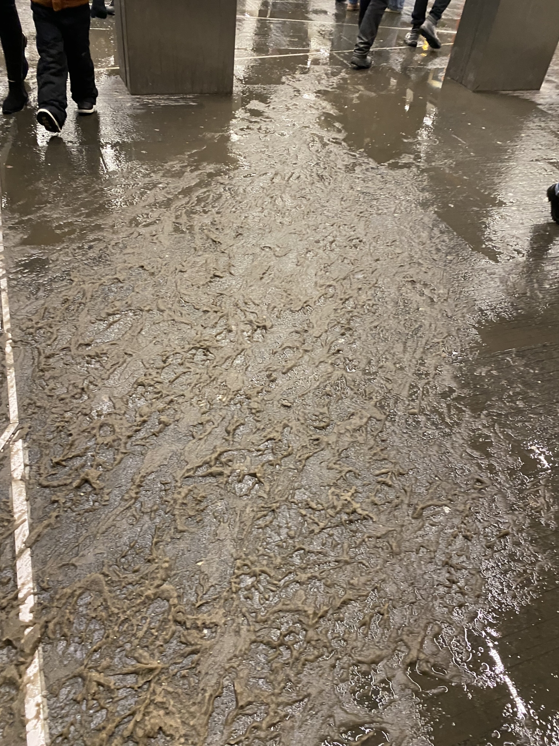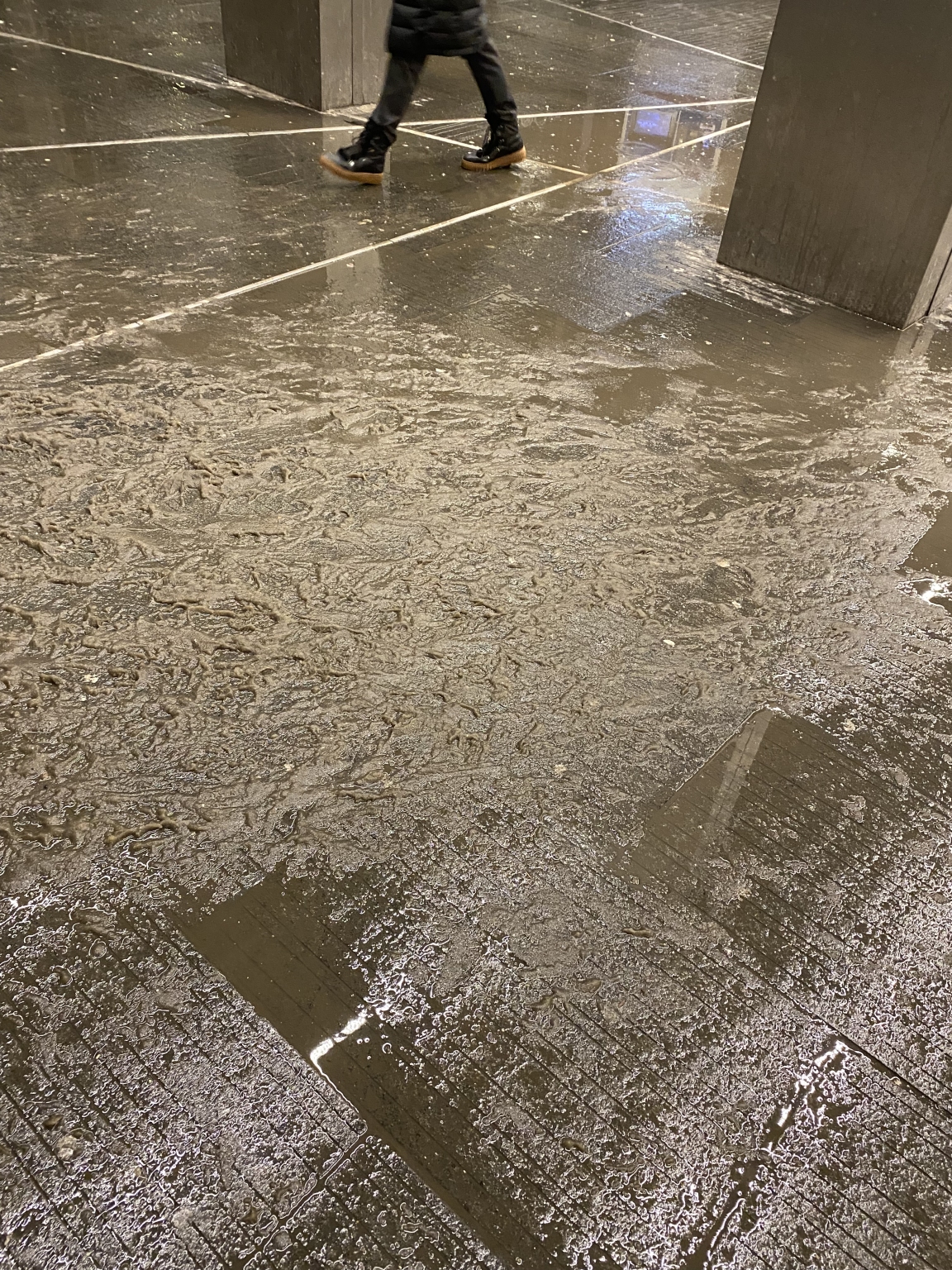 A Széll Kálmán tér metróépületében a burkolat állapota balesetveszélyes. A burkolat a latyak miatt rendkívül csúszóssá vált, ami fokozott kockázatot jelent a közlekedők számára. Kérem végezzék el a takarítást.
