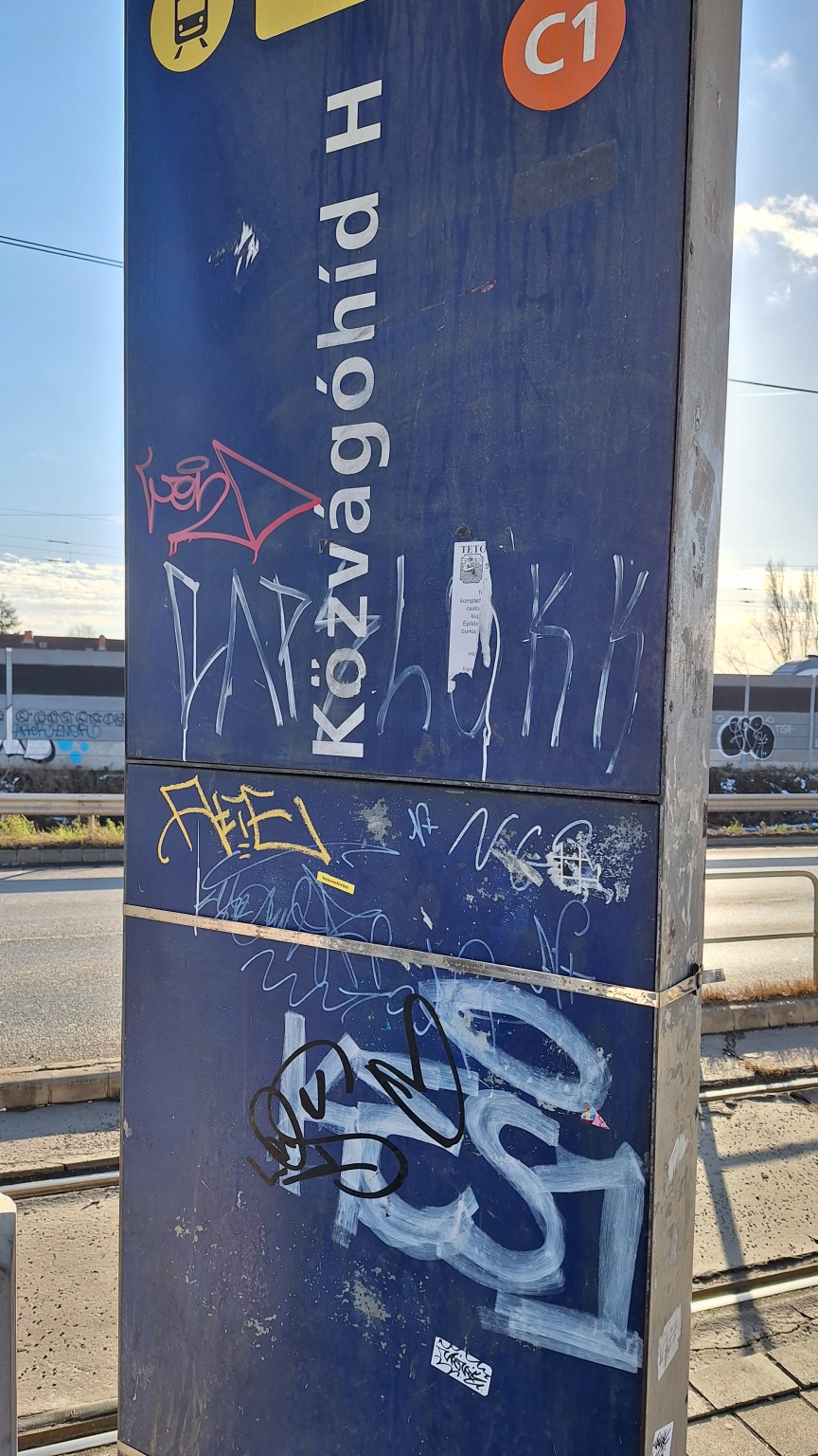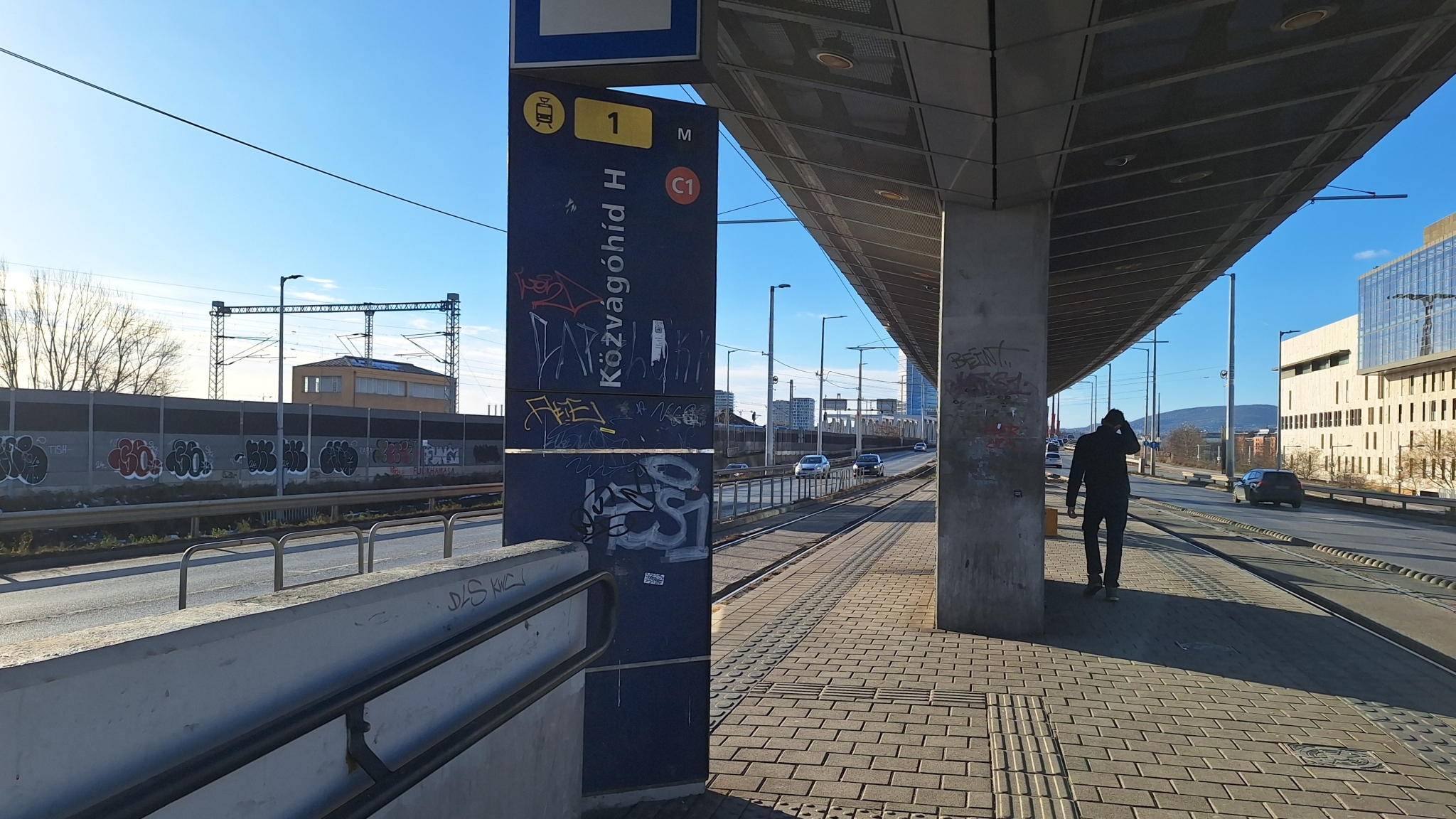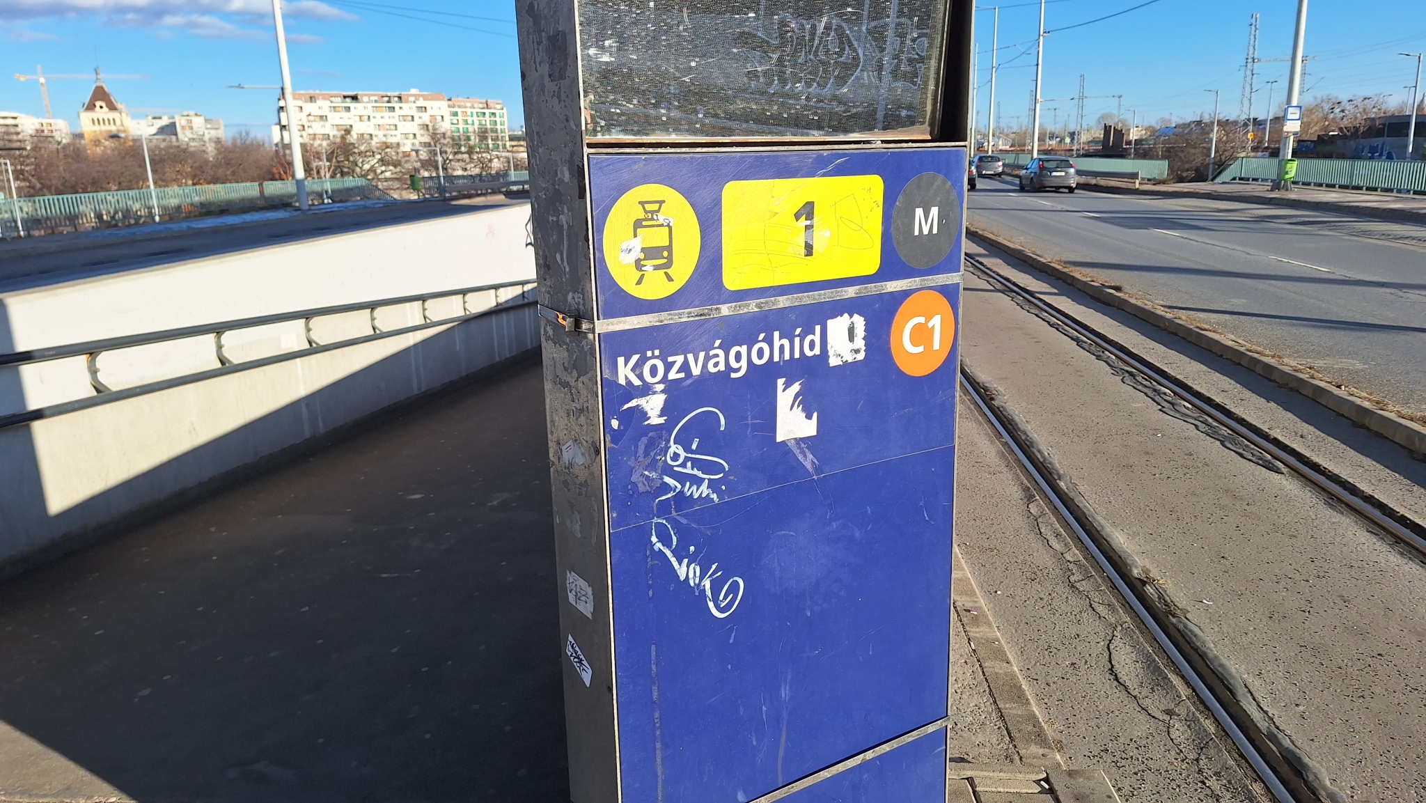 Az 1-es villamos Közvágóhíd megállójának táblája mocskos, szét van firkálva, ragasztgatva.