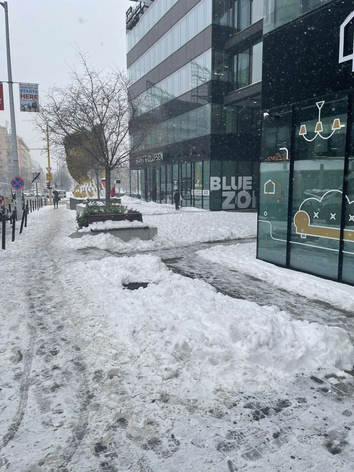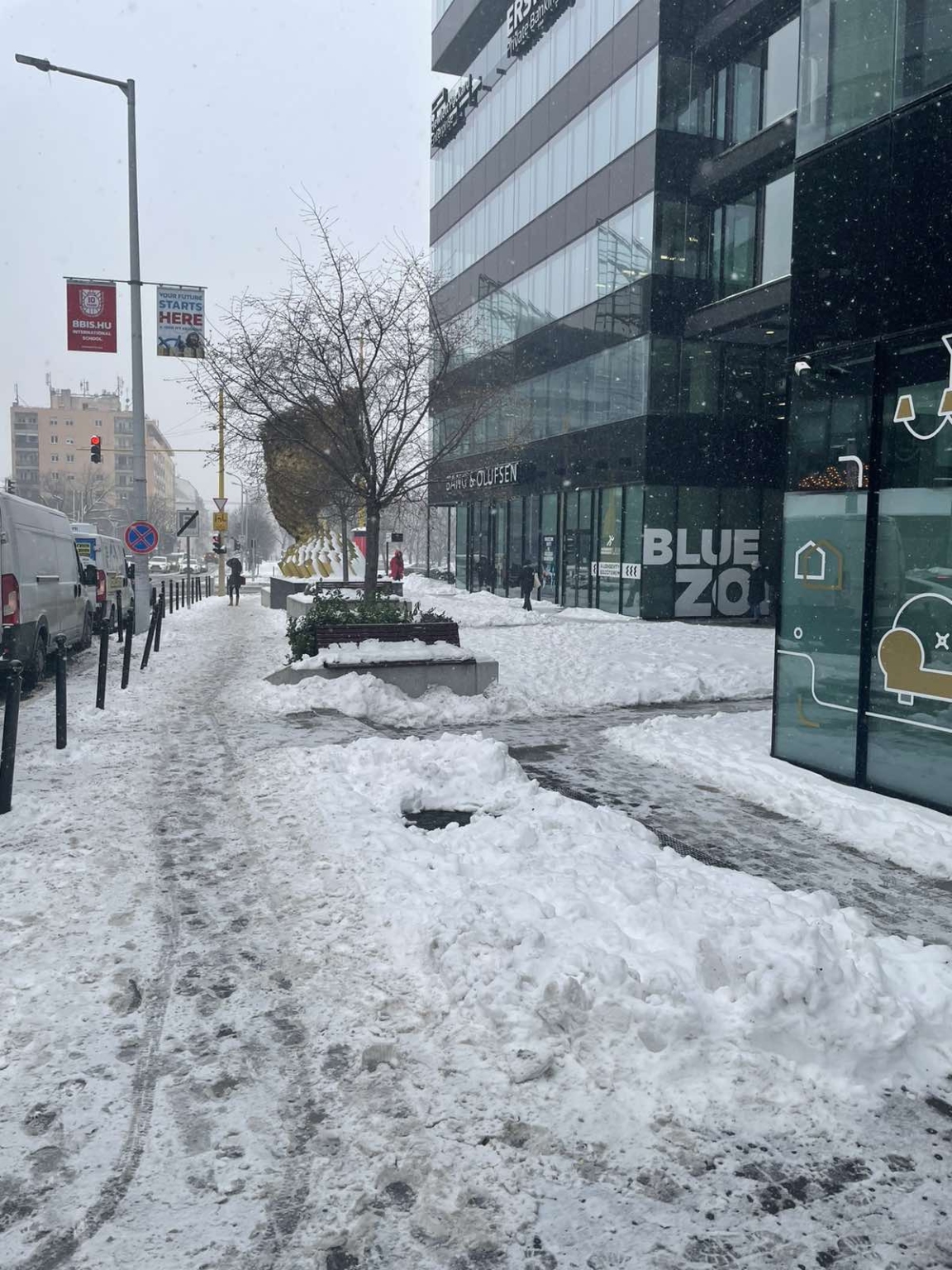 Ezúton teszek közérdekű bejelentést a 1123 Budapest, Alkotás utca 55–61. szám (Hillside irodaház) előtti járdaszakasz veszélyes, jeges és síkosság-mentesítés nélküli állapota miatt.