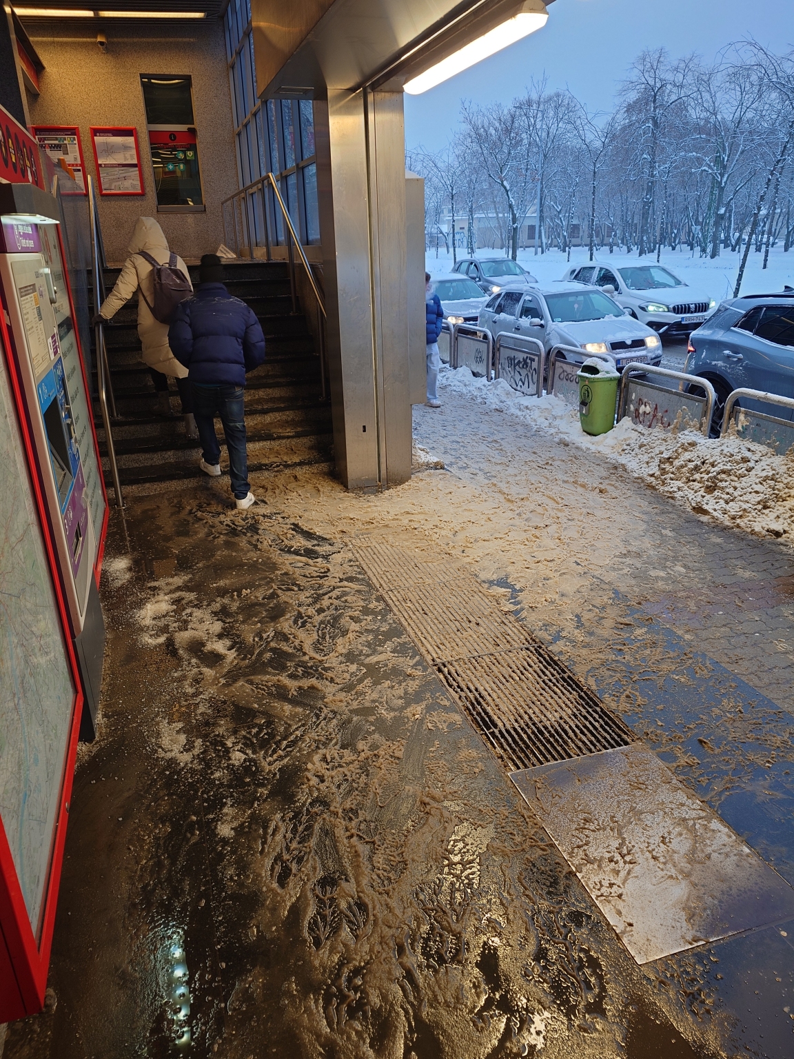 Az M2 metró Pillangó utcai állomásának bejárata rendkívül csúszós, latyakos, súlyosan balesetveszélyes. Emellett a bejárat és a 100-as busz megállója közötti járdaszakasz sincsen letakarítva, így az onnan érkező utasok is nagy mennyiségű havat hordanak fel a lépcsőkre. (A kép január 9-én 15:45-kor készült.)
