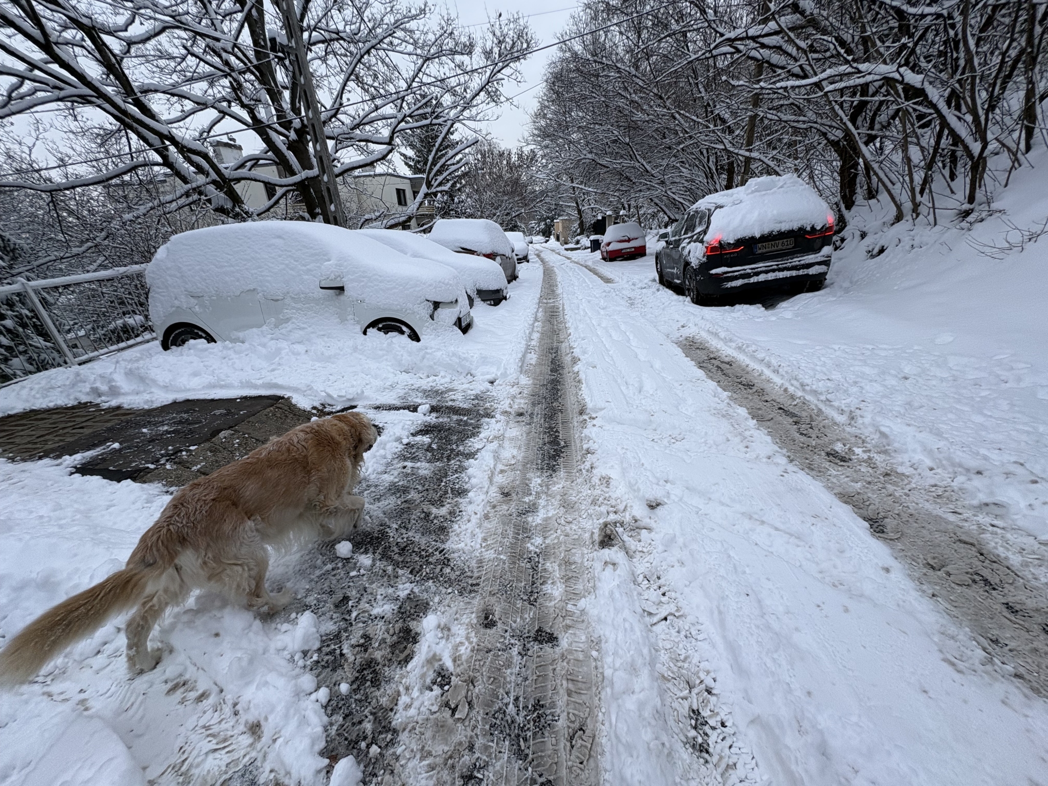 Az utcank nincsen megtisztítva. Meredek utca. Idős néniket kísérünk, mert nem lehet közlekedni.