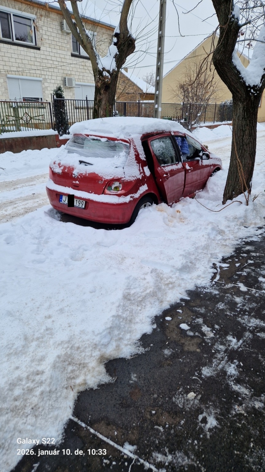 Kb. 7-10 napja parkol egy autó hóval jócskán betemetve az Erdő utcában.A hátsó üveg, valamint a jobb első üveg kivan törve.Néhol fóliával volt befedve, de már az is szakadozott ill. hiányos. Jobb hátsó lámpa törött. A bal hátsó ajtó félig nyitott.
