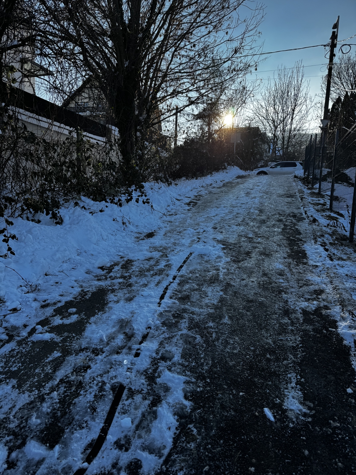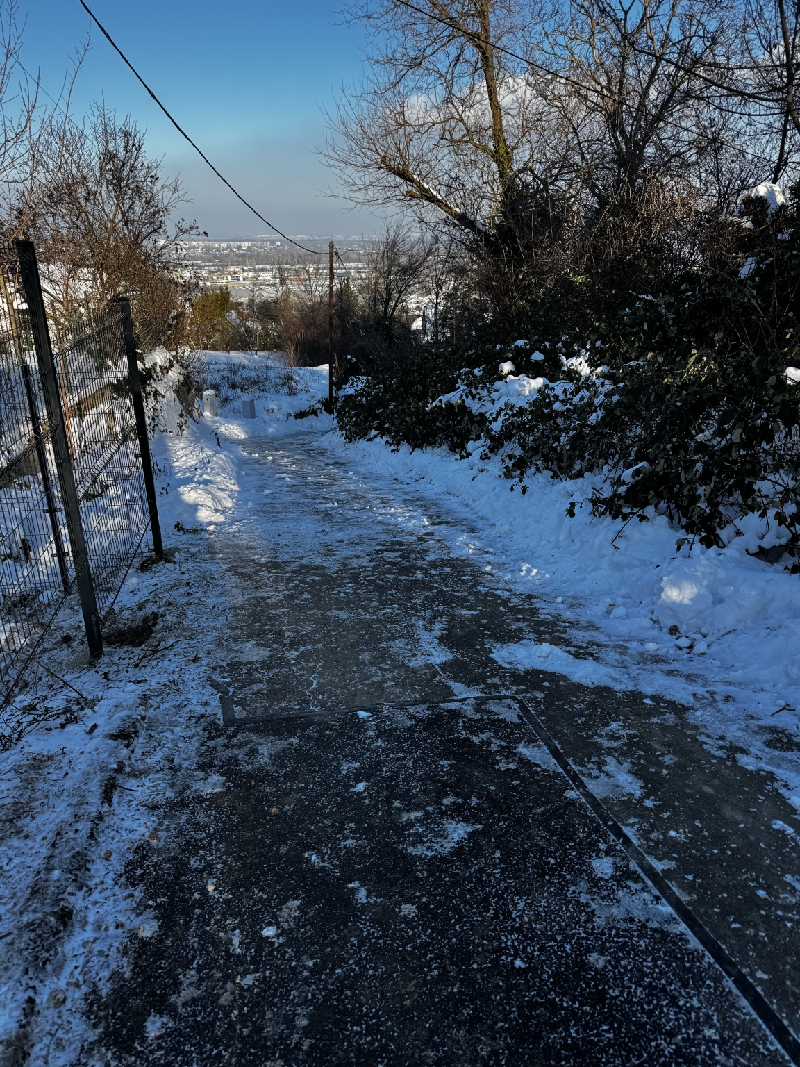 Az útszakasz súlyosan balesetveszélyes: az útfelületre ráfagyott a jég, nincs megfelelően felsózva, és napok óta nem történt karbantartás. Különösen aggasztó, hogy egy hete egy gépjármű nekicsúszott az utca végi korlátnak, mert a teljes szakasz nem volt tisztítva és fel nem sózva.
